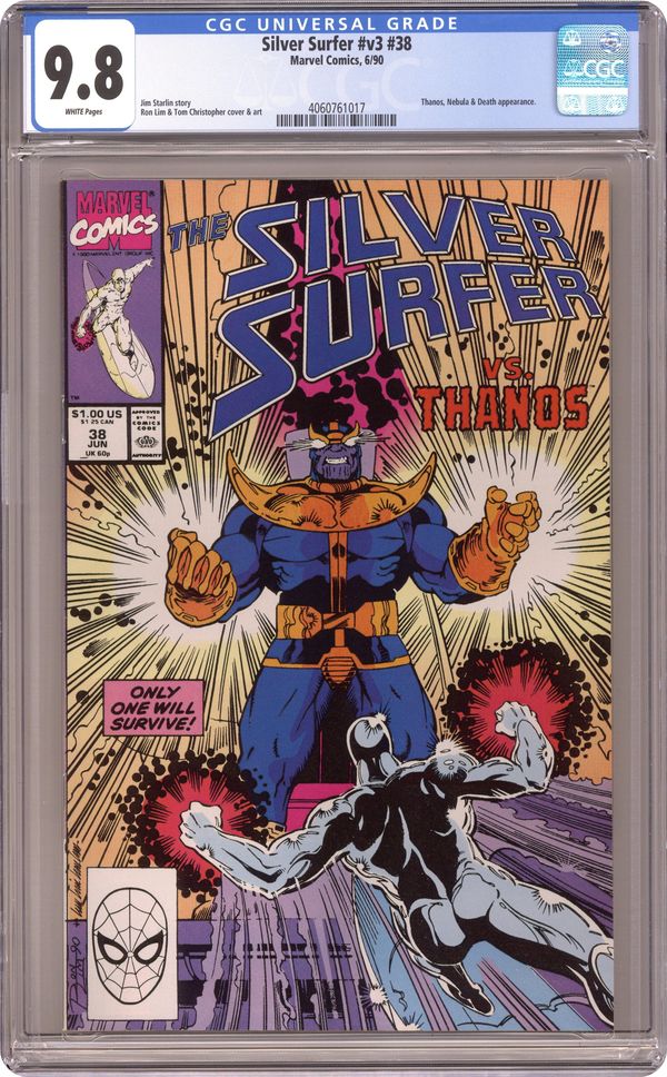 Infinity Gauntlet: Prelude - Rebirth of Thanos: Part 5 of 5 - "The Answer!" Story by Jim Starlin. Art by Ron Lim and Tom Christopher. The space pirate known as Nebula (last seen in Avengers #318), the granddaughter of the Mad Titan, Thanos, finally meets her infamous relative. It is an encounter that will leave her scared to say the least. Plus, at last...the Silver Surfer confronts Thanos and these two immensely powerful beings engage in a battle only one of them will walk away from. Story continues in Thanos Quest #1. 32 pages. Cover price $1.00. Grade: CGC 9.8 explanation of grade Condition: Used (collectible)