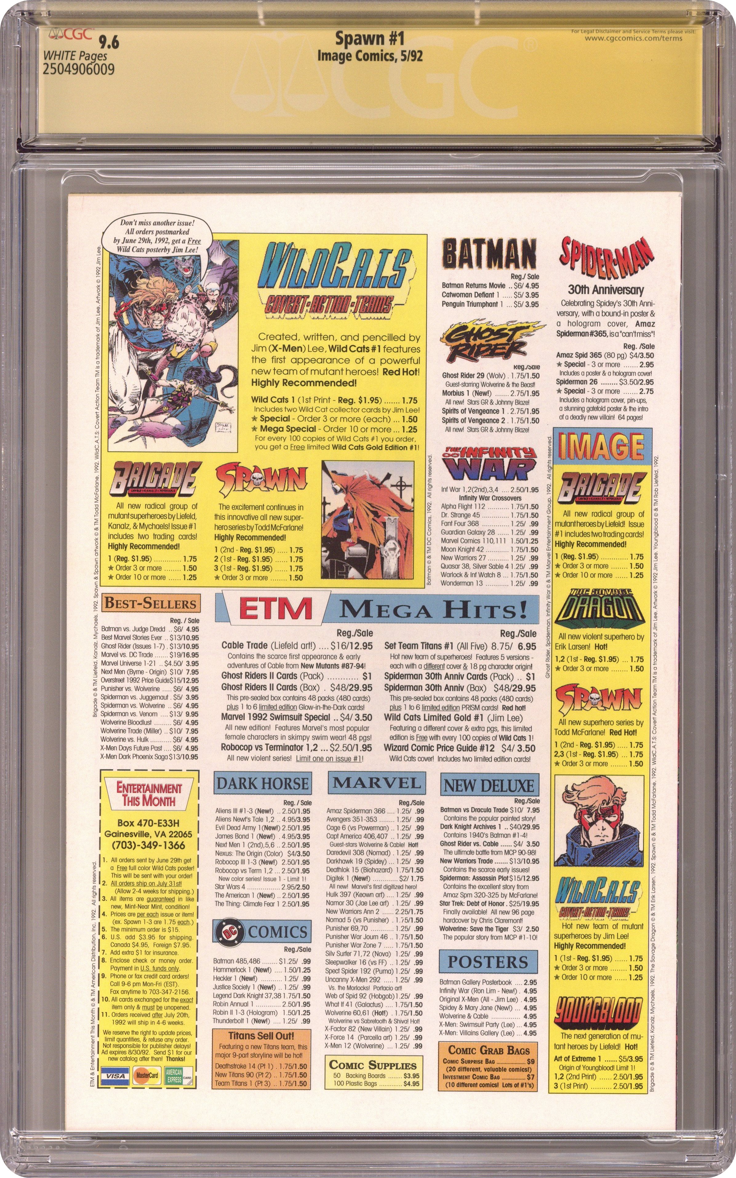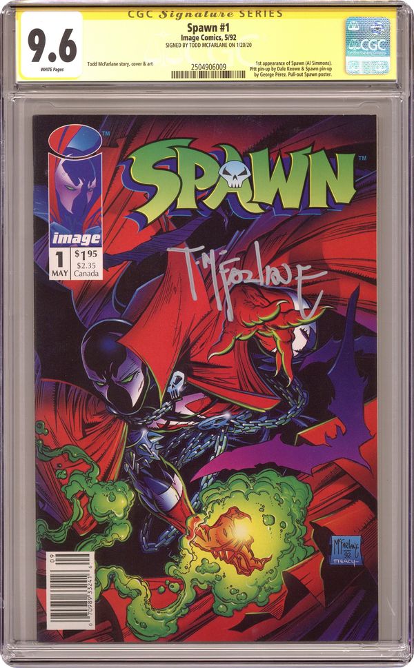 Newsstand edition. "Questions!" Part 1 of 4. Created, story, and art by Todd McFarlane. When government assassin Al Simmons is murdered, a deal with the devil brings him back to the realm of the living. But now he walks the shadows as the disfigured soldier of hell known as Spawn. Armed with unimaginable, but finite, magical abilities, Spawn is destined to play an important role in the upcoming Armageddon. But, what happens when this rebellious anti-hero decides he won't fight for either side? Superstar artist and Image co-founder, Todd McFarlane, creates a character who has gone on to inspire a major motion picture, an HBO animated series, numerous spin-off comic series, and one of the most successful toylines of all time. Spawn centerfold by Todd McFarlane & Ken Steacy. Pin-up of Spawn by George Perez. Pin-up of PITT by Dale Keown. Cover by McFarlane & Steacy. 1st app of Sam and Twitch Cover price $1.95. Grade: CGC 9.6 explanation of grade Condition: Used (collectible)
