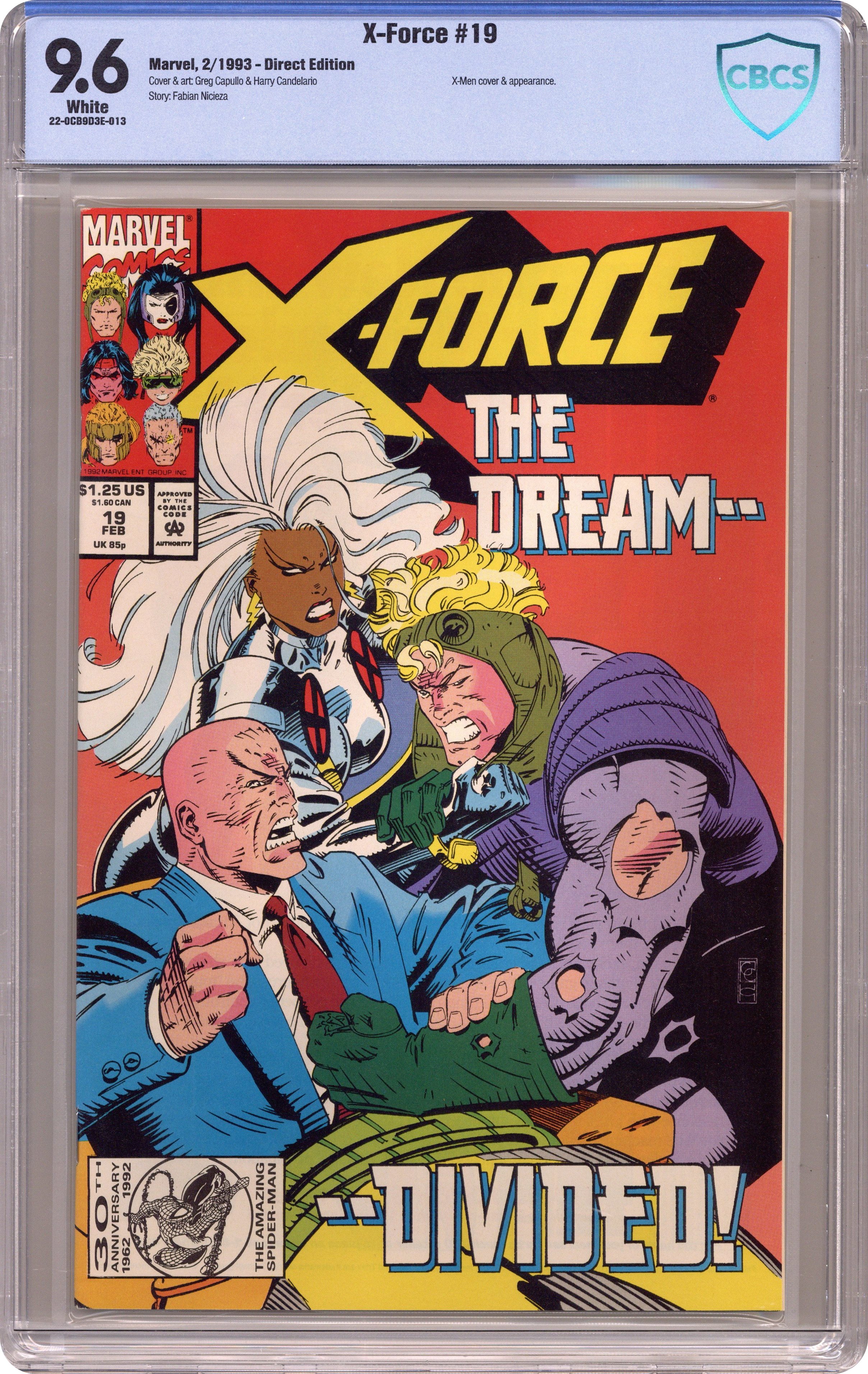 Ended Dec 12 2023 Winning Bid $19 Direct Edition. Cover pencils by Greg Capullo, inks by Harry Candelario. The Open Hand, The Closed Fist, script by Fabian Nicieza, pencils by Greg Capullo, inks by Harry Candelario; X-Force splits with Xavier and ventures forth on their own; Siryn joins. 36 pgs. $1.25. Cover price $1.25. Grade: CBCS 9.6 explanation of grade Condition: Used (collectible)