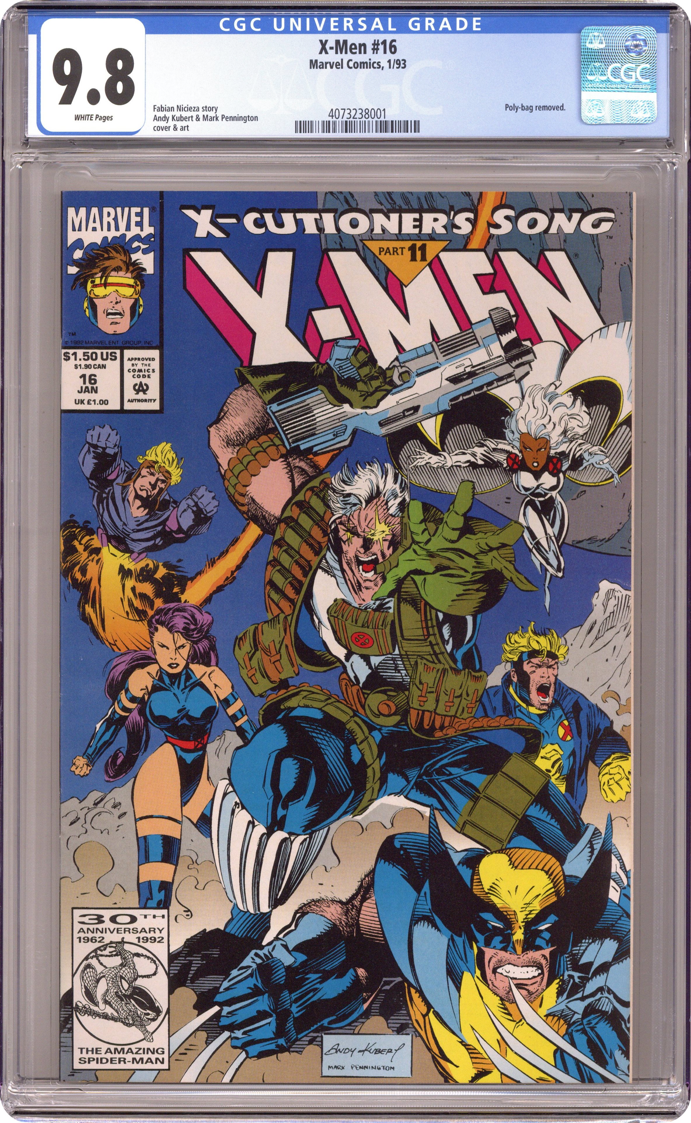Unbagged copy without trading card. X-cutioner's Song part 11. Cover pencils by Andy Kubert, inks by Mark Pennington. Conflicting Catheoes, script by Fabian Nicieza, pencils by Andy Kubert, inks by Mark Pennington and Andy Kubert (pgs. 20-23); It is a battle royale through Stryfe's moon base to try and reach him before he kills Scott and Jean; Cont. from X-Factor #86; Cont. in X-Force #18. 36 pgs. $1.25. Cover price $1.50. Grade: CGC 9.8 explanation of grade Condition: Used (collectible)