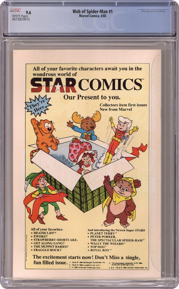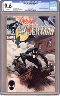 Direct Edition. "Til Death Do Us Part!" Story by Louise Simonson. Art by Greg LaRocque and Jim Mooney. Painted cover by Charles Vess. The alien symbiote (aka black costume) ambushes Peter Parker while he is getting dressed. Now Spider-Man must battle the black costume and the new Vulturions on his way to the Baxter Building! Meanwhile, Aunt May laments Peter's decision to drop out of graduate school. (Note: The Web of Spiderman series essentially replaced the Marvel Team-Up title as Marvel's third regular series featuring Spider-Man.) 32 pages Cover price $0.65. Grade: CGC 9.6 explanation of grade Condition: Used (collectible)