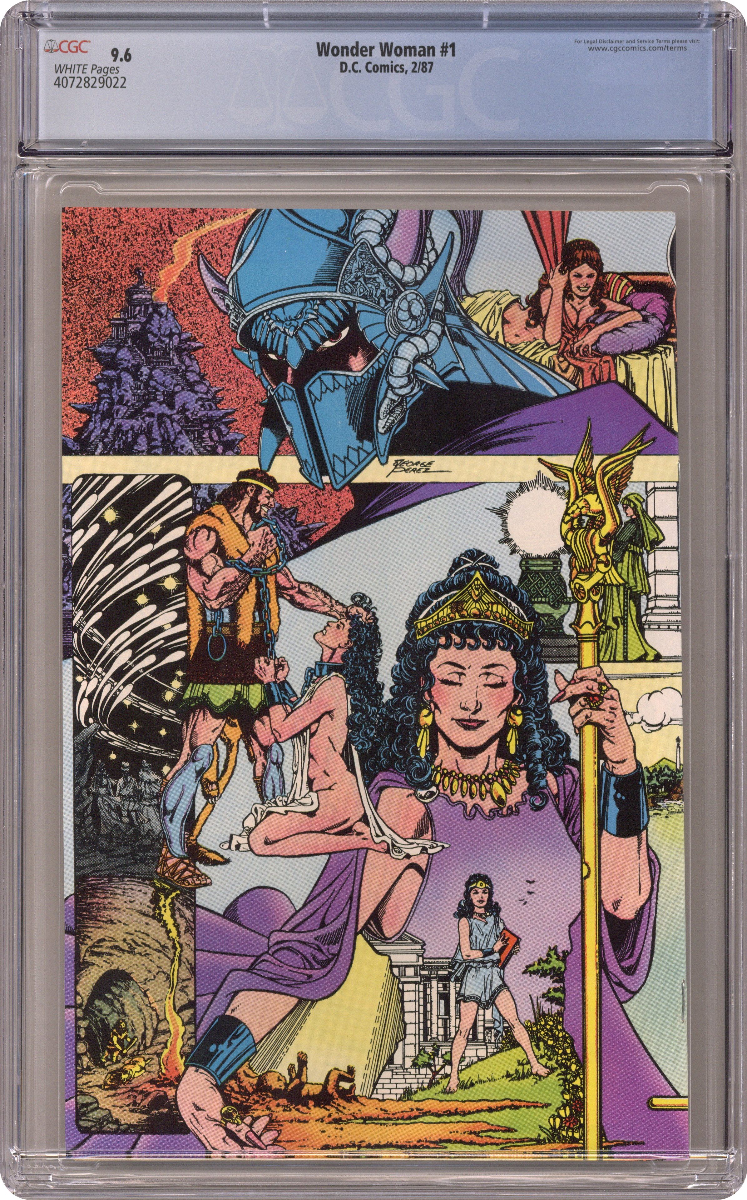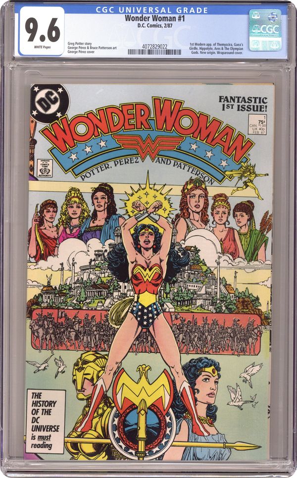 Direct Edition. In this post-Crisis on Infinite Earths re-imagining of the Wonder Woman mythos, Diana is born of clay, growing on Paradise Island to become the champion of the Amazons. "The Princess and the Power!" Part 1 of 6, continued next issue. Script by Greg Potter, co-plot and pencils by George Perez, inks by Bruce Patterson. Perez inks first 2 pages and the final page. Wrap-around cover. No ads. Perez cover. 36 pgs. Cover price $0.75. Grade: CGC 9.6 explanation of grade Condition: Used (collectible)