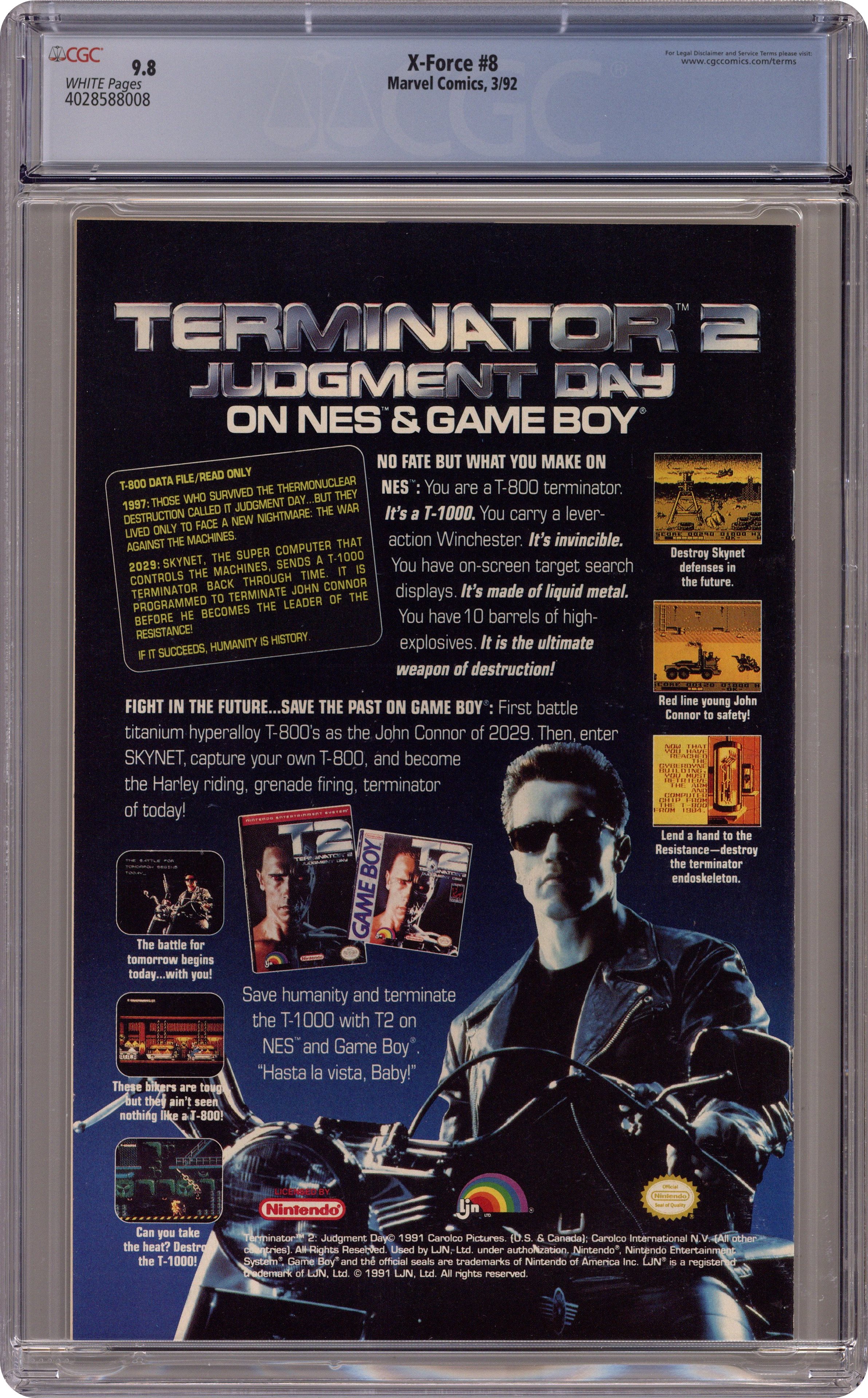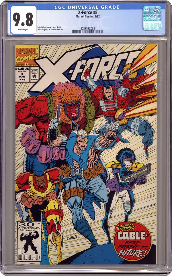 Direct Edition. Cover art by Rob Liefeld. Flashed Before My Eyes, script by Rob Liefeld (Plot) and Fabian Nicieza, pencils by Mike Mignola (pgs 2-19) and Rob Liefeld (pgs 1, 20), inks by Bob Wiacek and Rob Liefeld (pgs 1, 20); 1st origin of Cable; 1st appearance of the Wild Pack. 2 Cable pin-ups by Liefeld. 36 pgs. $1.25. Cover price $1.25. Grade: CGC 9.8 explanation of grade Condition: Used (collectible)