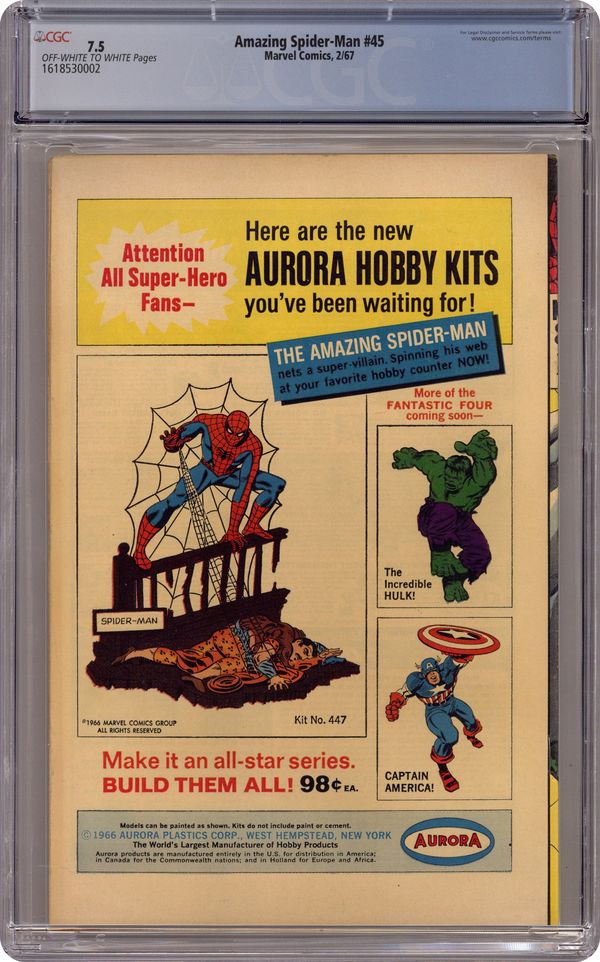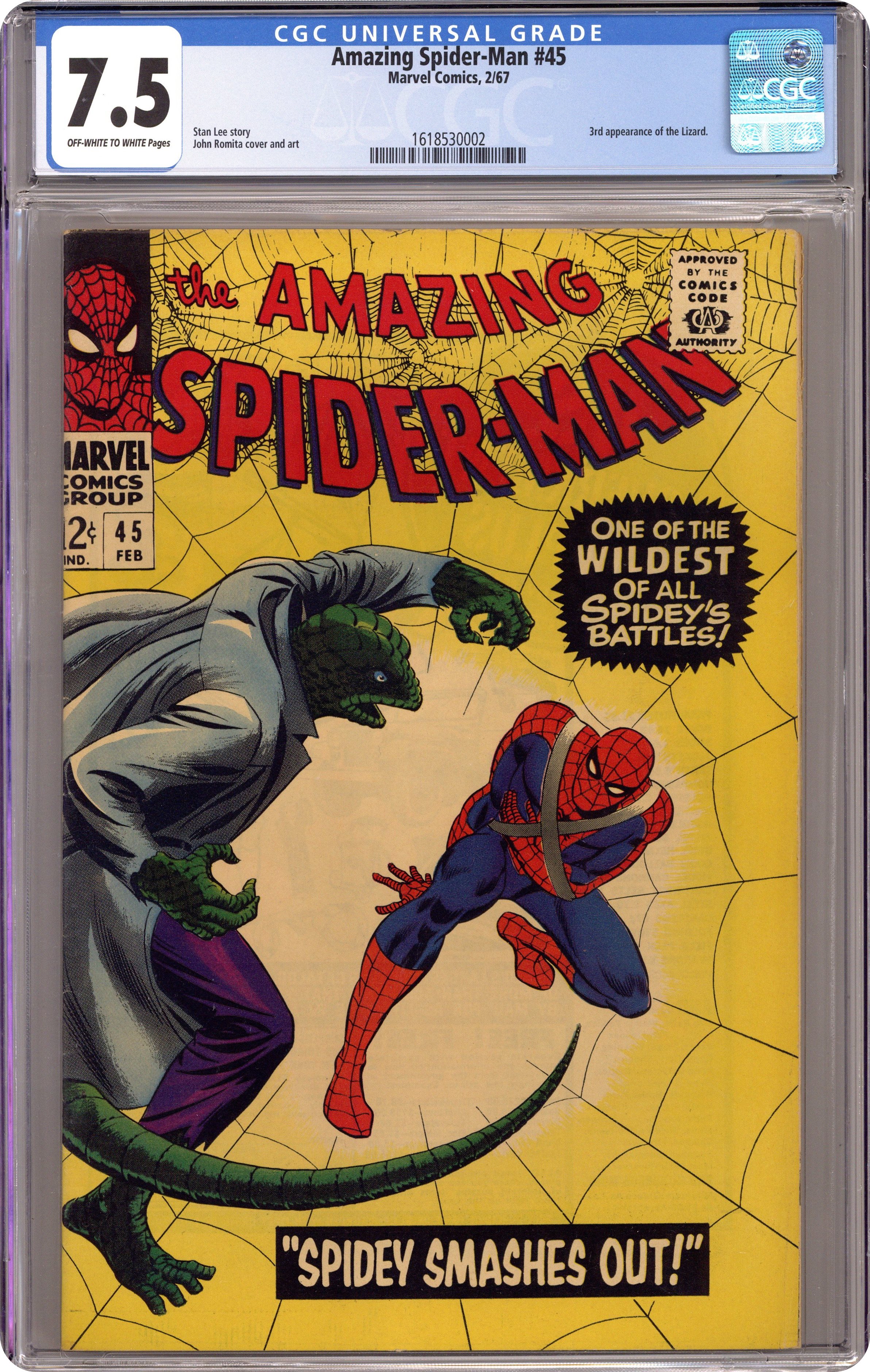 Cover by John Romita Sr.. The third appearance of the Lizard in Spidey Smashes Out!, script by Stan Lee, art by John Romita Sr.; The Lizard heads to Dr. Connor's lab to find a formula to transform reptiles into his personal army; Aunt May worries about Peter; The Lizard and Spider-Man battle aboard a train. Reprinted in Marvel Tales # 185. 36 pgs., full color. $0.12. Cover price $0.12. Grade: CGC 7.5 explanation of grade Condition: Used (collectible)