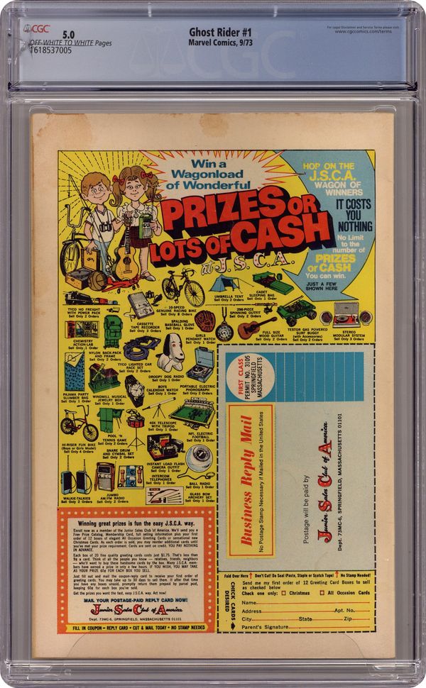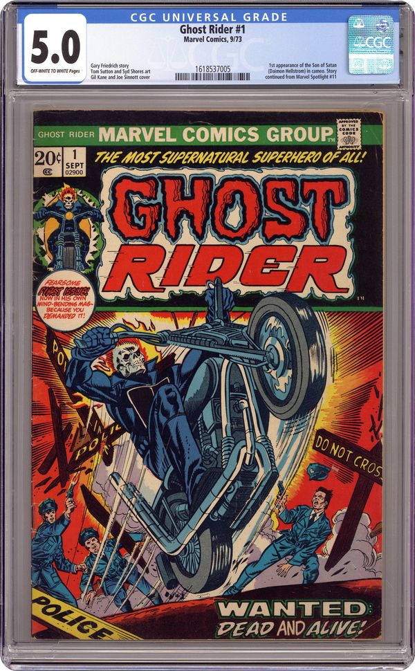 "A Woman Possessed!" Guest-starring Daimon Hellstrom (Son of Satan). Story by Gary Friedrich. Art by Tom Sutton and Syd Shores. Cover by Gil Kane. This issue picks up after the events in Marvel Spotlight (1971-1977 1st Series) #11. Johnny Blaze races against the clock to save a woman from a fate worse than death. Featuring the evil of Mephisto (as Satan). 32 pages, FC. NOTE: 1st appearance of Daimon Hellstrom (Son of Satan). Cover price $0.20. Grade: CGC 5.0 explanation of grade Condition: Used (collectible)
