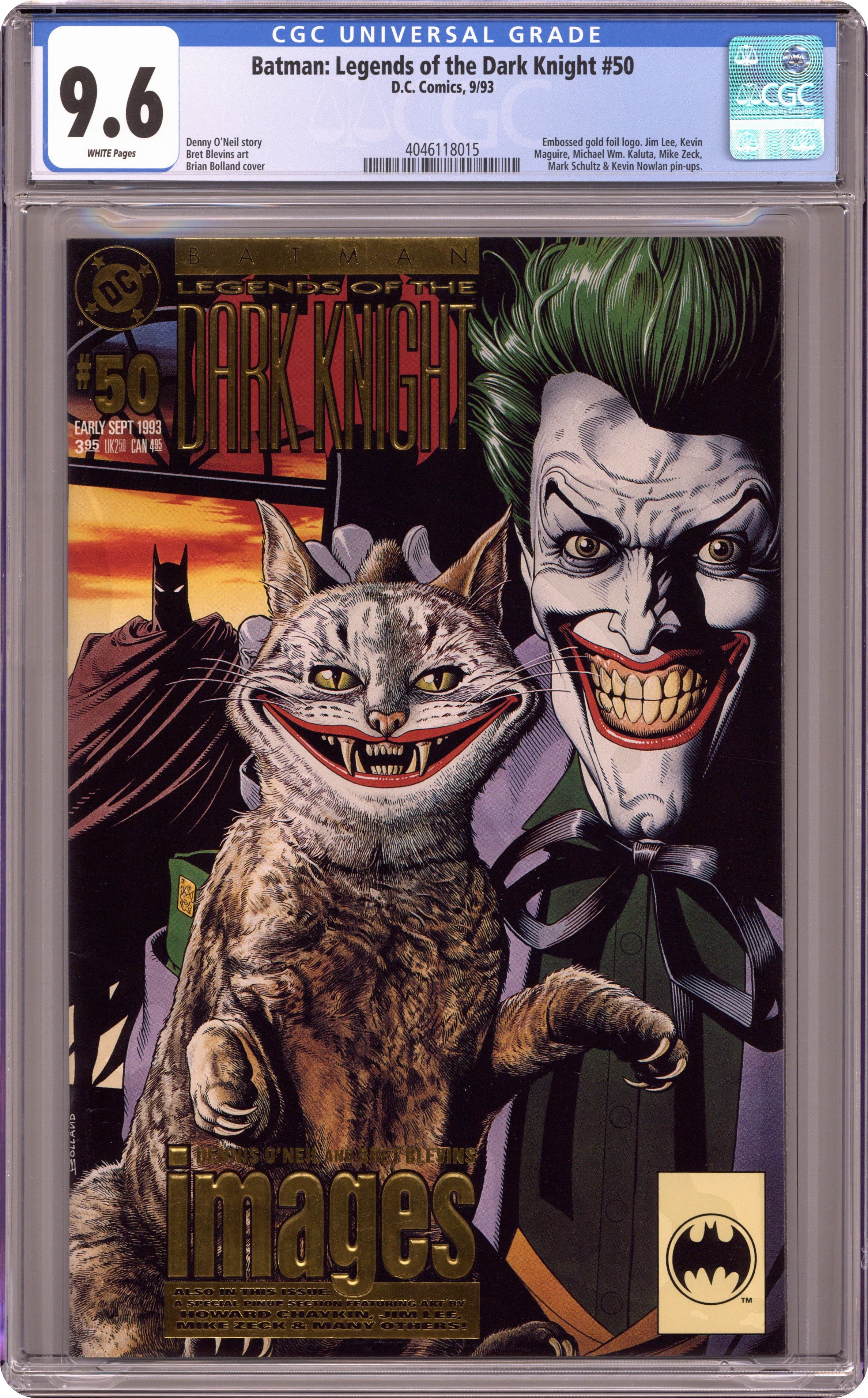 3.95-c, Embossed Gold Foil. It's Batman's first encounter with the Joker (sort of), and the Joker's cousin Melvin is also along for the ride, in "Images," a 40-page tale. Script by Dennis O'Neil, art by Bret Blevins. Plus: pin-ups by Jim Lee, Howard Chaykin, Phil Winslade, Kevin Maguire, P. Craig Russell, Ed Hannigan & John Beatty, Bob Wiacek & Walt Simonson, Sandy Plunkett, Tim Bradstreet, Brian Stelfreeze, Mark Schultz & Al Williamson, Kevin Nowlan, Michael W. Kaluta, Mike Zeck. Cover by Brian Bolland. **NOTE: This is the direct market edition with gold-embossed logo and title lettering (newstand edition is plain).** Cover price $3.95. Grade: CGC 9.6 explanation of grade Condition: Used (collectible)