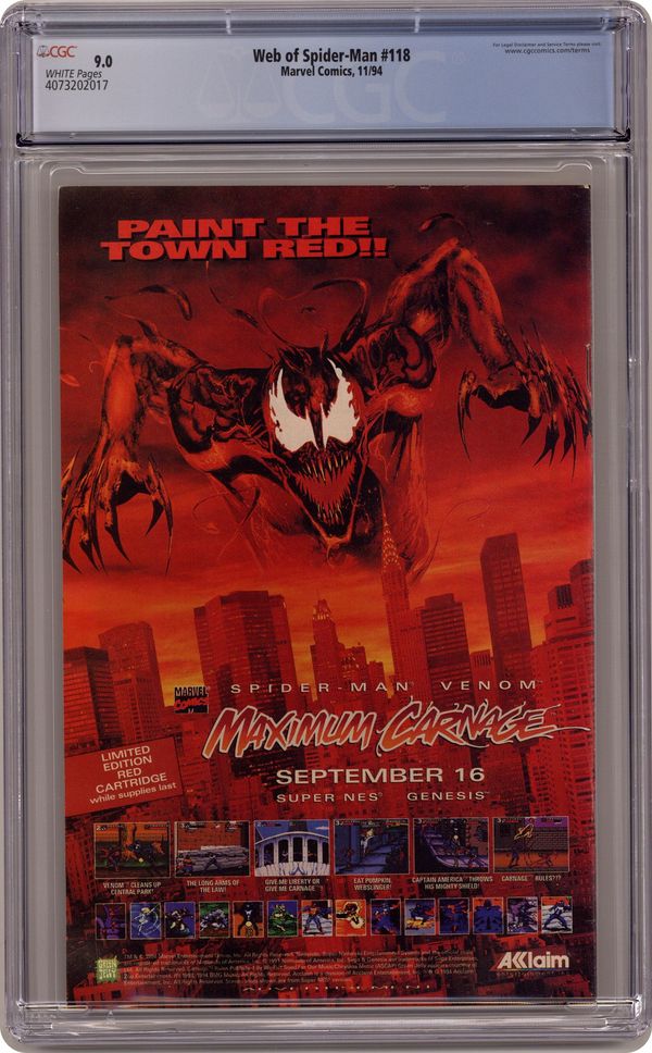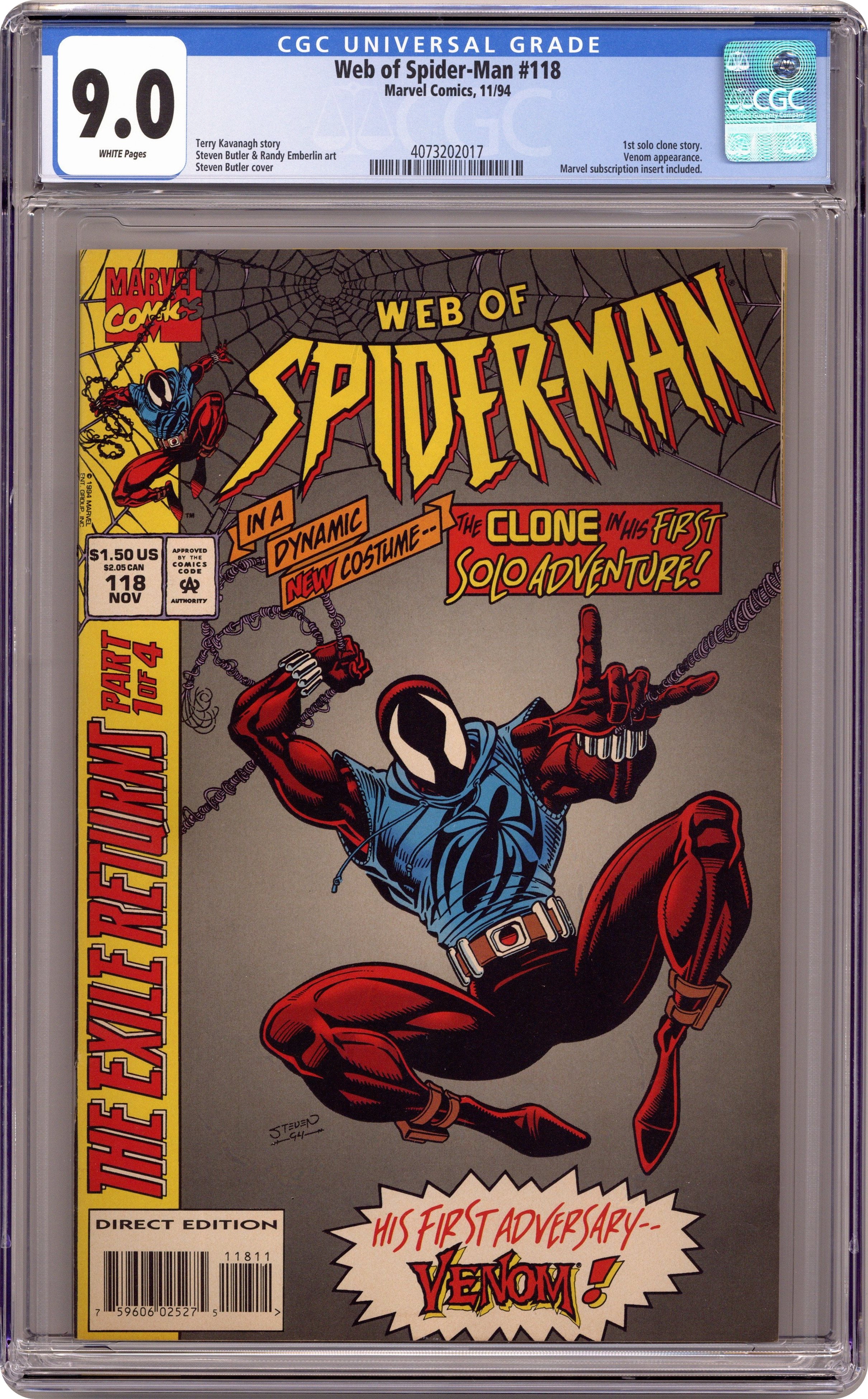 First Printing. Direct Edition. "Exiles Return Part 1 of 4: Memories" Written by Terry Kavanagh. Pencils by Steve Butle. Inks by Randy Emberlin. Venom and Clone appear. Note: First appearance of Ben Reilly as the Scarlet Spider. Cover price $1.50. Grade: CGC 9.0 explanation of grade Condition: Used (collectible)