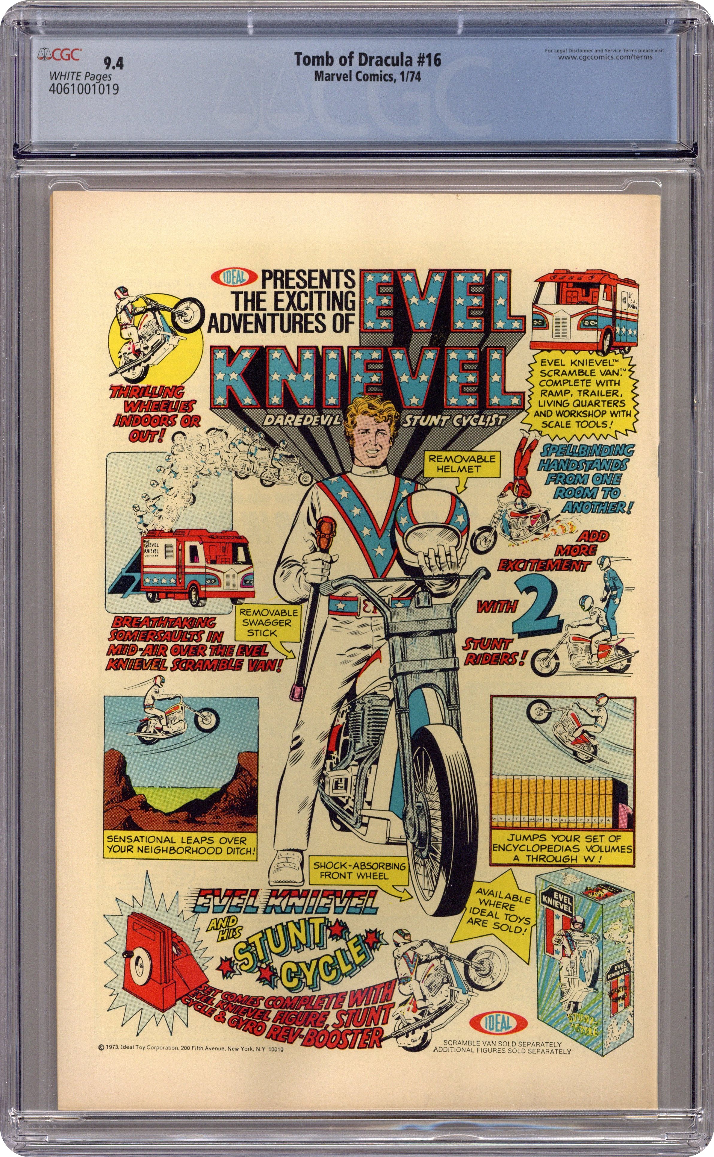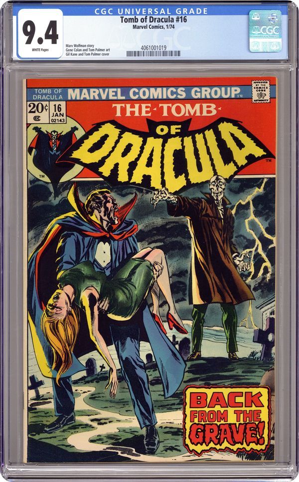 "Return From the Grave!" Written by Marv Wolfman. Art by Gene Colan and Tom Palmer. The Lord of Vampires will soon learn that he is not the only creature of the night to return from the grave... Plus, who is Doctor Sun ans why will he go on to become one of Dracula's greatest adversaries? 32 pages, FC. NOTE: 1st appearance of Doctor Sun. Cover price $0.20. Grade: CGC 9.4 explanation of grade Condition: Used (collectible)