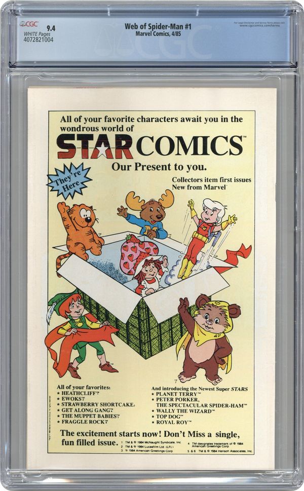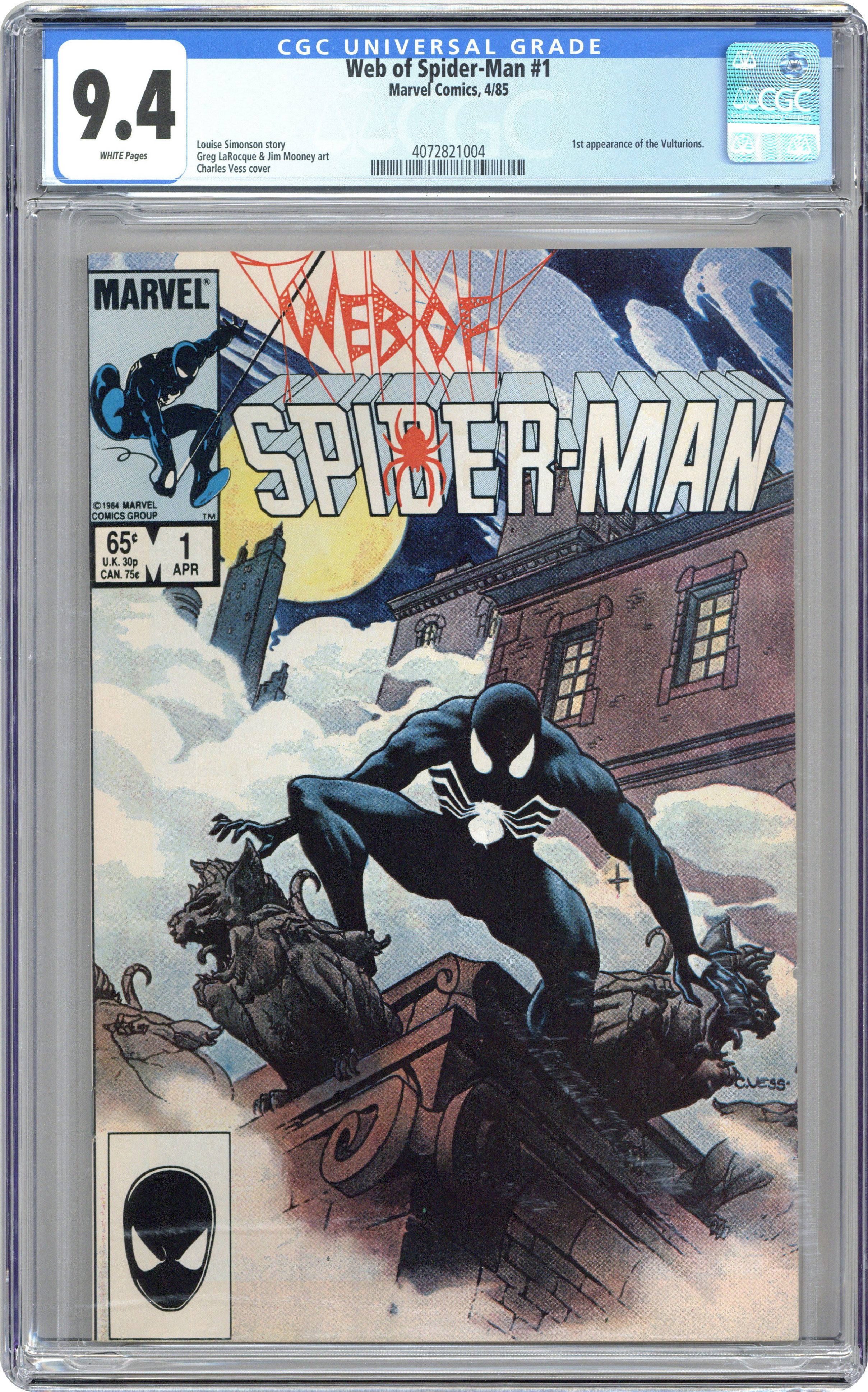 Direct Edition. "Til Death Do Us Part!" Story by Louise Simonson. Art by Greg LaRocque and Jim Mooney. Painted cover by Charles Vess. The alien symbiote (aka black costume) ambushes Peter Parker while he is getting dressed. Now Spider-Man must battle the black costume and the new Vulturions on his way to the Baxter Building! Meanwhile, Aunt May laments Peter's decision to drop out of graduate school. (Note: The Web of Spiderman series essentially replaced the Marvel Team-Up title as Marvel's third regular series featuring Spider-Man.) 32 pages Cover price $0.65. Grade: CGC 9.4 explanation of grade Condition: Used (collectible)