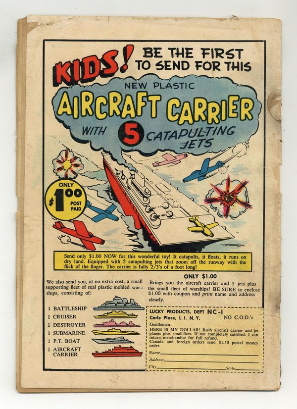 SOLD$105.00- 7" cumulative spine split, severe water damage and staple rust/migration, cover and centerfold detached. Mold.
