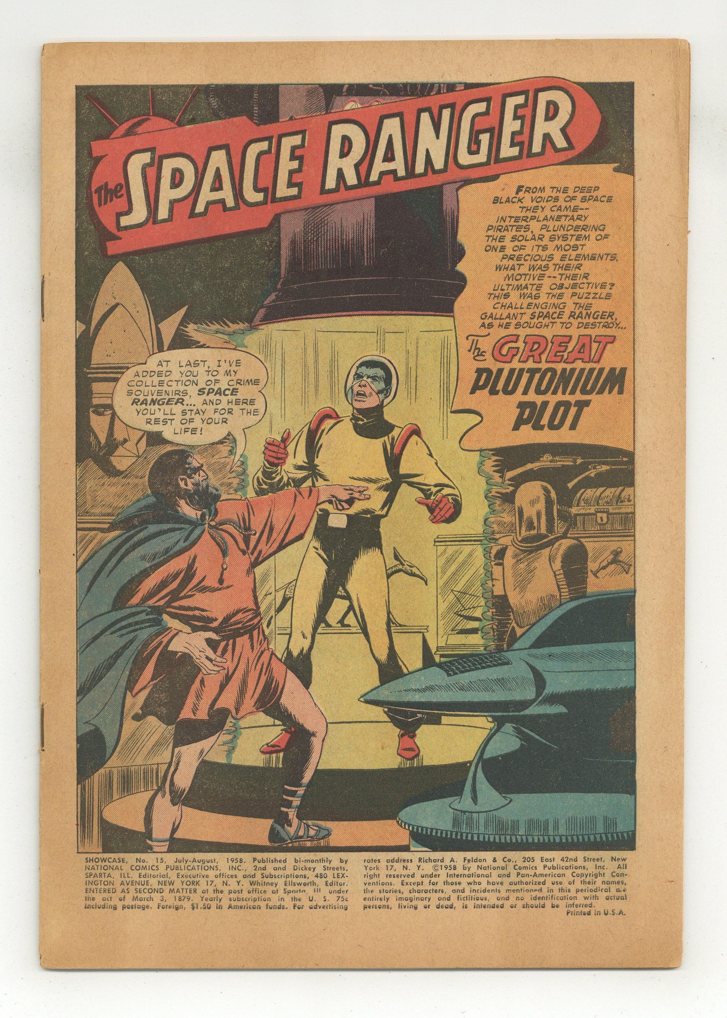 Cover by Bob Brown. 1st appearance of the Space Ranger in "The Great Plutonium Plot," script by Gardner Fox (plot) and Edmond Hamilton (script), art by Bob Brown; A renegade scientist is stealing all the Plutonium in the galaxy; He hopes to rule the Solar System with his "Teleportator," but needs the radioactive chemical to power it; The Space Ranger follows a few space pirates (via an Audium trail - soundwaves) and is able to locate their hideout. "The Robot Planet," script by Gardner Fox (plot) and Edmond Hamilton (script), art by Bob Brown; Rick Starr finds an odd machine floating in space and takes it aboard his ship to study back at headquarters; Later, he and Cryll receive a surprise visit from Myra, who tells them that there are odd machines orbiting the sun, pulling the planets, including Earth, out of their orbit; When she sees the machine they were examining, Myra exclaims that it's just like the others; Rick is determined more than ever to examine the machine and get to the bottom of this threat; He finds that the device is made from a metal found on a world in the Sirius system, and he takes off with Myra and Cryll to find out more. Space Ships of the Past, art by Jack Kirby. 36 Pages, Full Color. Cover price $0.10. Grade: Coverless explanation of grade Condition: Used (collectible)