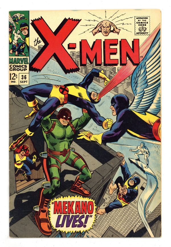 Cover pencils by Ross Andru, inks by George Roussos. Mekano Lives!, script by Roy Thomas, pencils by Ross Andru, inks by George Roussos [as George Bell]; the X-Men try to make money to go to Europe, where the Factor Three is; they battle Mekano and save the Central Library; First full appearance of Merkano. 36 pgs. $0.12. Cover price $0.12. Grade: VG/FN 5.0 explanation of grade Condition: Used (collectible)