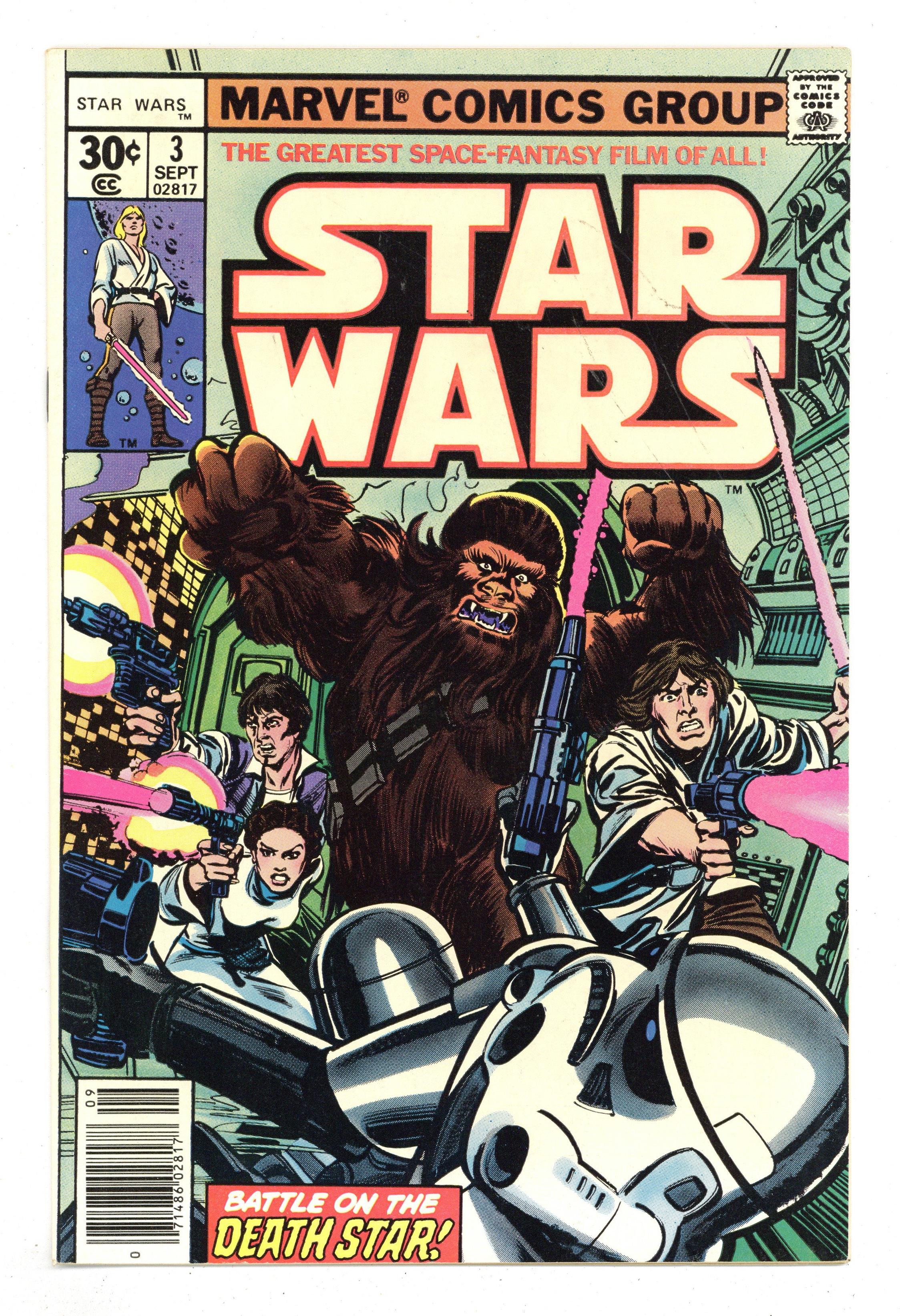 1st printing, standard 30 Cent Newsstand Edition with UPC. A New Hope: Part 3 of 6. "Death Star!" Based on the screenplay by George Lucas. Adapted by Roy Thomas. Art by Howard Chaykin and Steve Leialoha. The evil Galactic Empire tests its ultimate weapon on Princess Leia's homeworld with devastating results. Meanwhile, Ben Kenobi begins Luke Skywalker's training in the ways of the force. However things take a turn for the worse when the Millennium Falcon is captured within the unrelenting grasp of the Death Star's tractor-beam. Now, it's up to this small motley band of heroes to mount a daring rescue attempt of the Princess from within the very bowels of the Empire's most powerful weapon. Cover price $0.30. Grade: NM- 9.2 explanation of grade Condition: Used (collectible)
