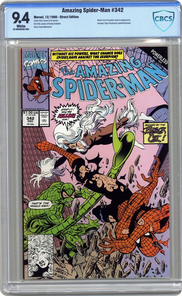 Ended Dec 15 2023 Winning Bid $17 Direct Edition. "The Jonah Trade" Powerless Part 2 of 3. Script by David Michelinie. Pencils by Erik Larsen. Inks by Randy Emberlin. Cover by Erik Larsen and Al Gordon. Last issue the powerless web-slinger got by with a little help from his friends! But that was against the Tarantula! Next up: the Scorpion! Yikes! Similar to the Tarantula's modus operandi, the pointy-tailed villain takes a hostage (in this instance J. Jonah Jameson) and demands a swap for the wondrous wall-crawler! And again, like last issue, the powerless Spider-Man makes a call for assistance...to the Black Cat! Will Felicia rush to the aid of her former boyfriend one more time? And what does Mary Jane think about all this? It doesn't matter now, because the Scorpion can't wait! First appearance of Dr. Elias Wirtham (aka Cardiac). Cameo appearances by Aunt May and the Chameleon. 40 pages. $1.00 cover price. Cover price $1.00. Grade: CBCS 9.4 explanation of grade Condition: Used (collectible)