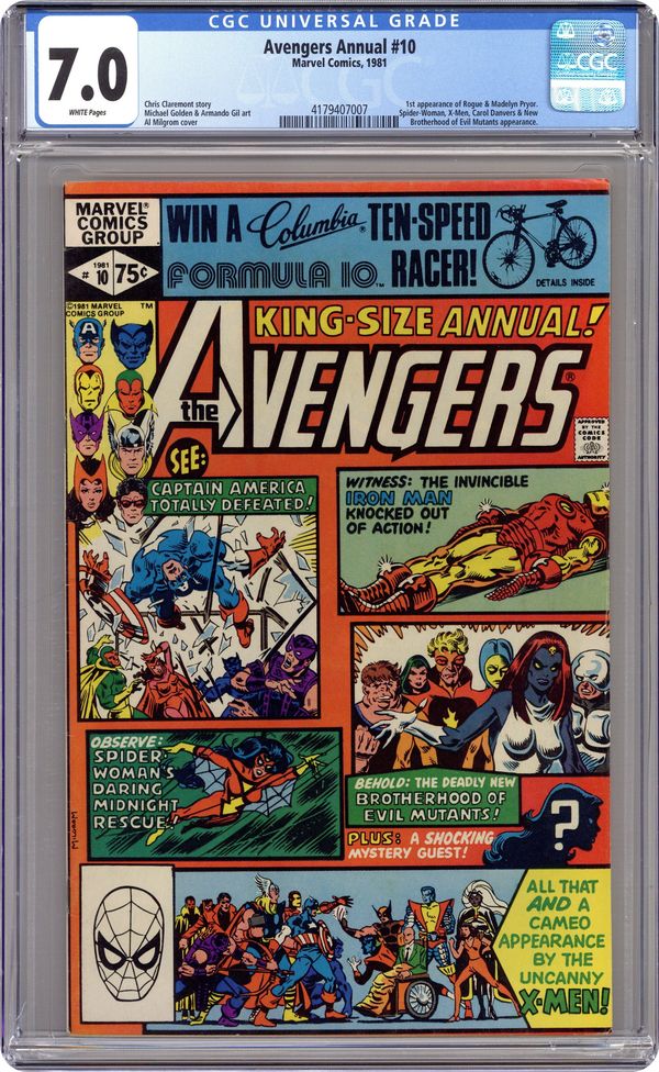 Direct Edition. First appearance of Rogue and Madelyne Pryor in "By My Friends Betrayed!" Spider-Woman, X-Men, Carol Danvers, and New Brotherhood of Mutants guest star. Script by Chris Claremont. Pencils by Michael Golden. Inks by Armando Gil. Cover by Al Milgrom. This action-packed annual has got it all, true believers: the first appearance of Rogue, the spectacular art of Michael Golden, the tragic return of Carol Danvers, and the stupendous struggle between the Brotherhood of Evil Mutants and the mighty Avengers! Following the events of Uncanny X-Men #142, Mystique & her New Brotherhood of Evil Mutants attempt to break four of their members out of Ryker's Island prison! After Rogue and Mystique take down Captain America, Iron Man, and Thor, the rest of the Avengers and Spider-Woman catch up to the villains, and the epic clash erupts! Woven in and around the frantic action at Ryker's Island is the heartbreaking story of Carol Danvers' return to Earth. Her life has fallen apart since leaving for Limbo with Marcus Immortus in Avengers #200, and now, stripped of her powers and memories, Carol begins the long road to recovery. And the first step is an emotional confrontation with her former teammates! Notes: Marvel Super-Heroes #11 (Fall 1992) fills in the details of Carol Danvers' life between Avengers #200 and Avengers Annual #10. The Thing stars in a one-page Hostess ad, "A Lesson to Be Learned!" This issue was reprinted in 1993 in the trade paperback: The Greatest Battles of the Avengers. 52 pages, full color. Cover price $0.75. Grade: CGC 7.0 explanation of grade Condition: Used (collectible)