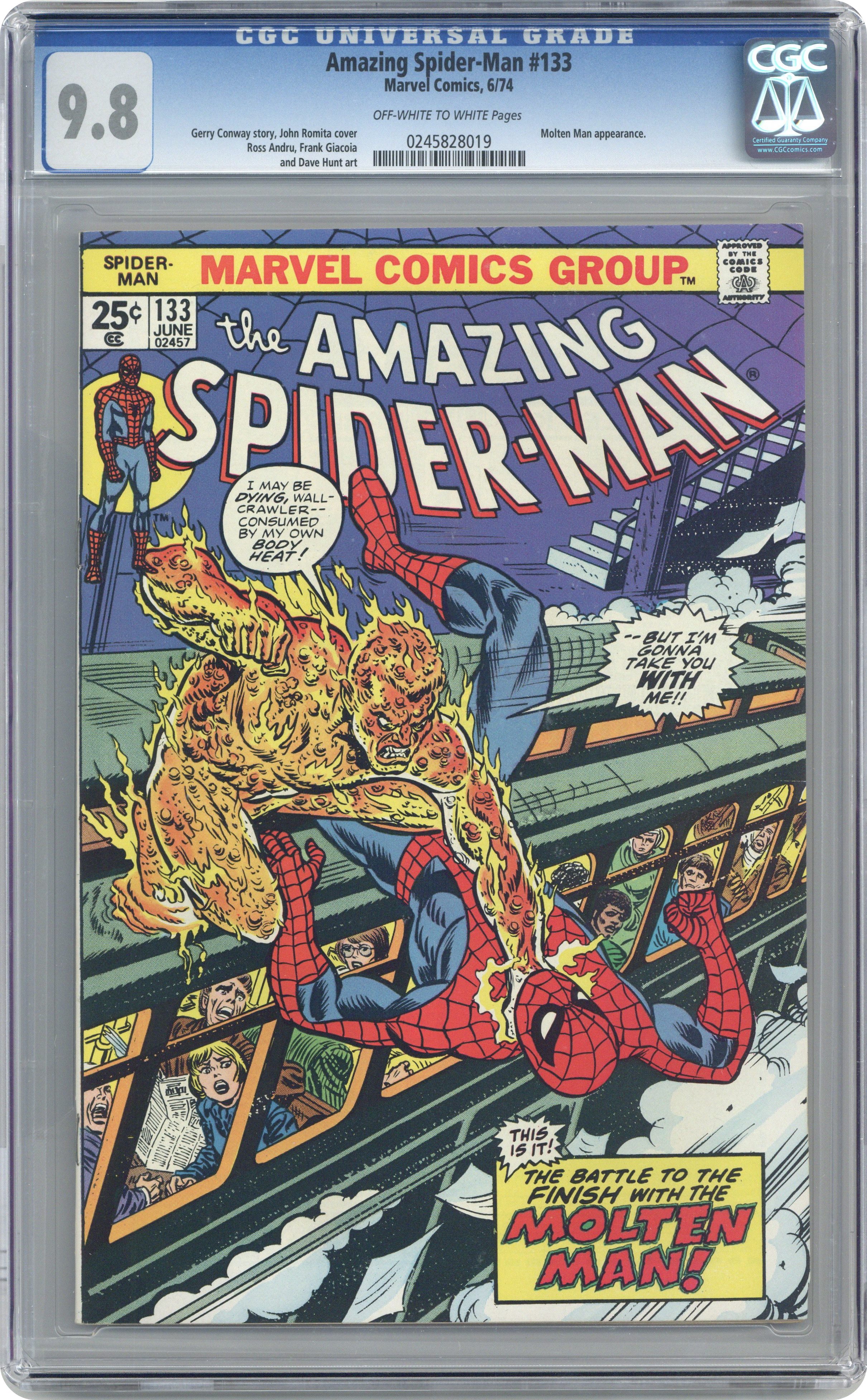 Cover by John Romita Sr. The Molten Man Breaks Out!, script by Gerry Conway, pencils by Ross Andru inks by Frank Giacoia and Dave Hunt; Ned Leeds and Spider-Man are sickened by Molten Mans irradiated bursts; MJ finds out about Molten Mans past through her friend, Liz Allan; Who was Mark Raxton before he was a villain?; And what is he seeking from Spider-Man? Letters page has Marvel Value Stamp series A # 66 (General Ross). Reprinted in Marvel Tales # 110. 36 pgs., full color. $0.25. Cover price $0.25. Grade: CGC 9.8 explanation of grade Condition: Used (collectible)