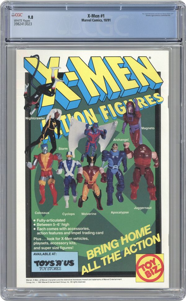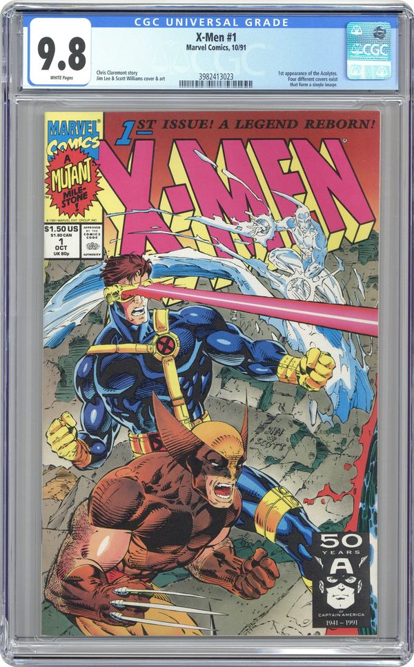Direct Edition. Cyclops/Wolverine/Iceman cover. Cover pencils by Jim Lee, inks by Scott Williams. Rubicon, script by Jim Lee (Co-Plot) and Chris Claremont, pencils by Jim Lee, inks by Scott Williams; Magneto forms the Acolytes and proclaims Asteroid M a haven for mutants everywhere; But the rest of the world doesn't see it that way; Nick Fury cameo. 2-page pin-up: gallery of X-Men villains. X-Men Sketchbook by Jim Lee. Cover price $1.50. NOTE: Cover C connects to covers 1A, 1B, and 1D to form a single giant image. Cover price $1.50. Grade: CGC 9.8 explanation of grade Condition: Used (collectible)