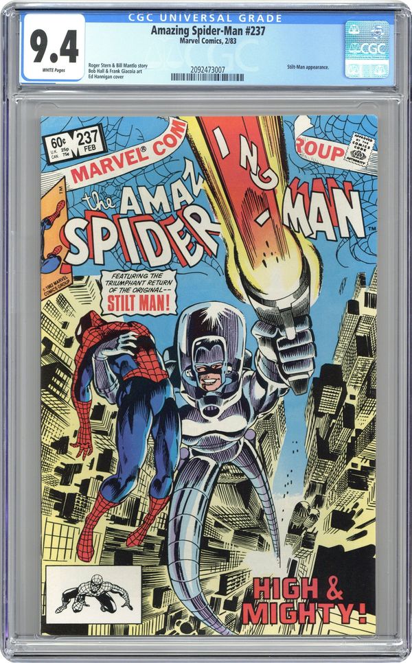 Direct Edition. "High & Mighty!" Plot by Roger Stern. Script by Bill Mantlo. Art by Bob Hall (breakdowns) and Frank Giacoia (finishes). Cover design by Ed Hannigan. The original Stilt-Man is down on his luck and desperately wants to reverse his fortune! So he decides to challenge the only superhero he has ever beaten...Spider-Man! After breaking into Cordco's R&D laboratory and improving his battlesuit, the Stilt-Man surprisingly gets his chance! The web-slinger just happens to be in the neighborhood! Will the Stilt-Man remain undefeated against the wall-crawler? Or can Spidey even the score? (Notes: The Stilt-Man previously appeared in Daredevil 186. The letters page contains a preview of the cover to Amazing Spider-Man 238 (depicting the Hobgoblin). This issue includes a full-page ad featuring the Hulk and the Magic Snake Puzzle.) 36 pages Cover price $0.60. Grade: CGC 9.4 explanation of grade Condition: Used (collectible)