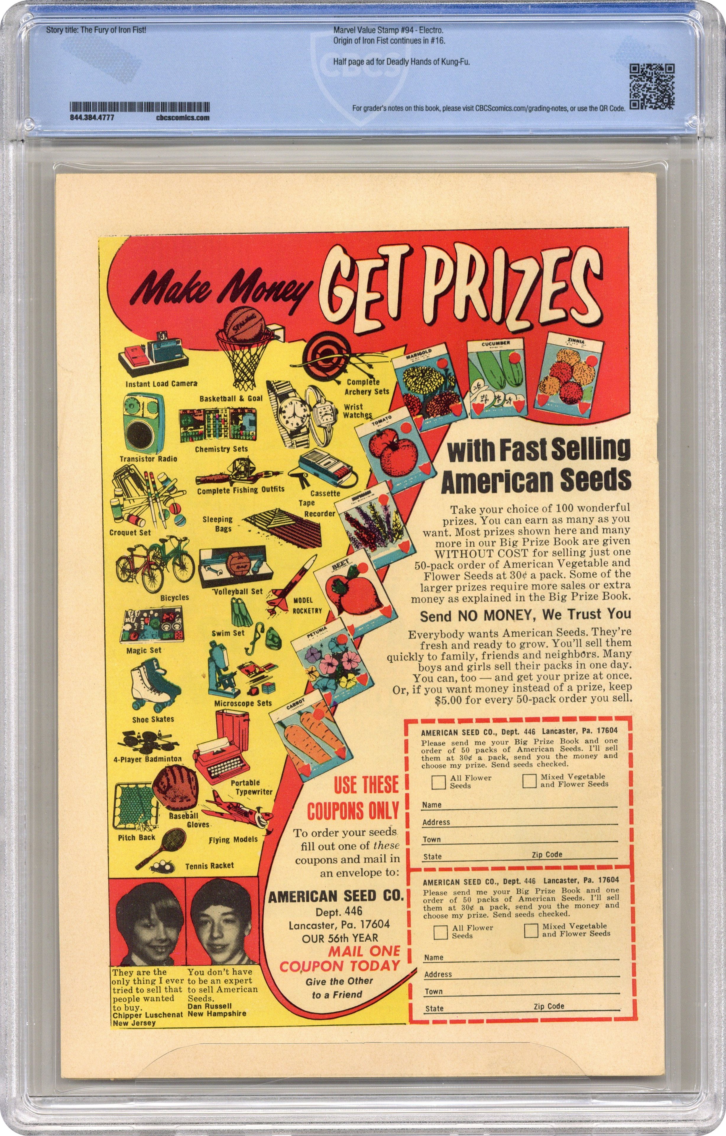 First 25-cent cover price. Origin and first appearance of Iron Fist in The Fury of Iron Fist!, script by Roy Thomas, pencils by Gil Kane, inks by Dick Giordano; Iron Fist passes the final tests in his K'un-Lun training and is granted the privilege of immortality if he so chooses; During his final battle with the robot Shu-Hu, Danny remembers how his father was killed by Meachum and his mother gave her life to save his as the Rand family searched for the fabled city of K'un-Lun. The letters page contains Marvel Value Stamp series A # 94 (Electro by Steve Ditko). Text article explaining price hike to 25 cents for Marvel's 36-page comics, followed by short editorial by Roy Thomas detailing genesis of Iron Fist. 36 pgs. $0.25. Cover price $0.25. Grade: CBCS 2.5 explanation of grade Condition: Used (collectible)
