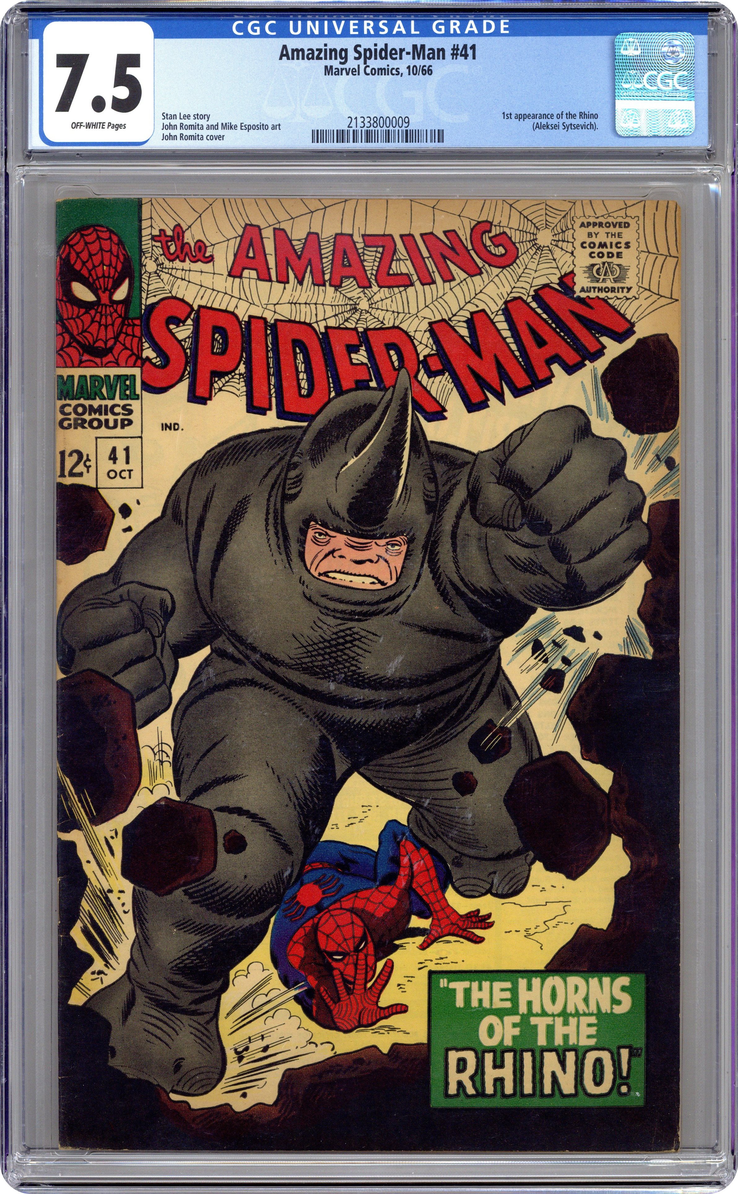 Ended Jul 14 2023 Winning Bid $1,302 Cover pencils by John Romita Sr., inks by Mike Esposito and John Romita (touch-ups). First appearance of the Rhino in The Horns of the Rhino!, script by Stan Lee, pencils by John Romita Sr., inks by Mike Esposito (as M. Demeo) and John Romita Sr. (touch-ups); The Rhino attempts to kidnap John Jameson to turn him over to foreign powers that want his secrets about the U.S. space program; Spider-Man manages to stop the Rhino. Reprinted in Marvel Tales # 30 and 190. 36 pgs., full color. $0.12. Cover price $0.12. Grade: CGC 7.5 explanation of grade Condition: Used (collectible)