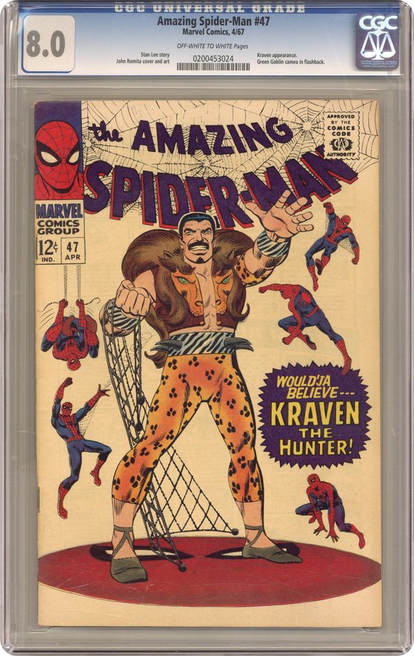 Cover by John Romita Sr. "In the Hands of the Hunter," script by Stan Lee, art and cover by John Romita Sr.; Kraven the Hunter wants cash from Norman Osborn for attacking Spider-Man; since Norman is out of town, Kraven kidnaps Norman's son, Harry, at a party; Spider-Man appears, and he and Kraven fight, but when Norman shows up he can't remember who Kraven is, so doesn't pay him the money; Kraven escapes while Spidey saves Norman. Reprinted in Marvel Tales # 33 and 187. 36 pages, full color. Cover price $0.12. Grade: CGC 8.0 explanation of grade Condition: Used (collectible)