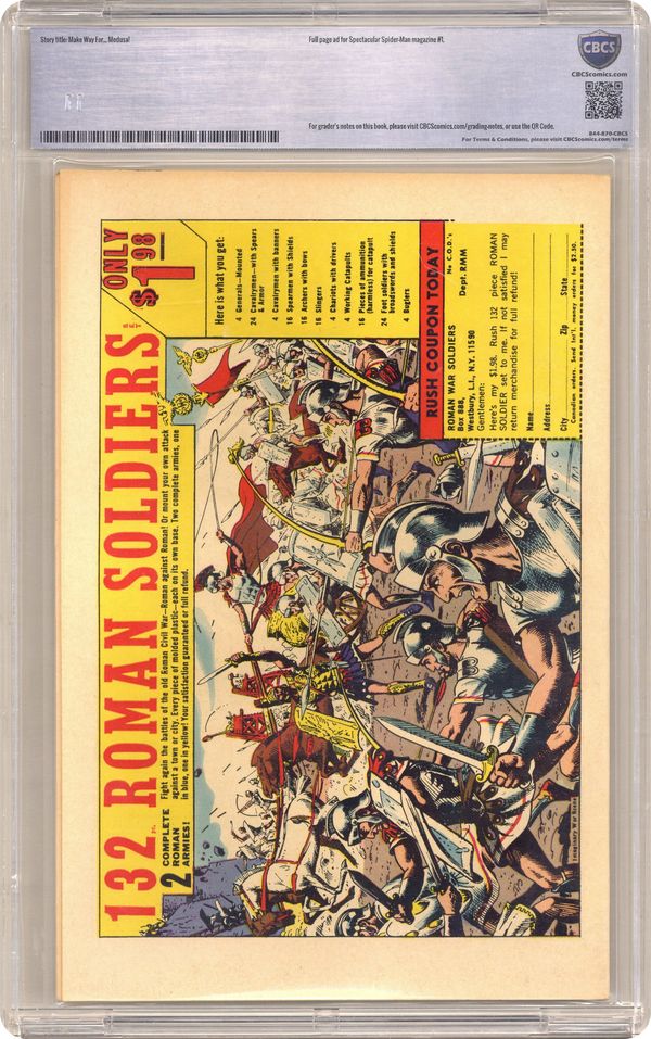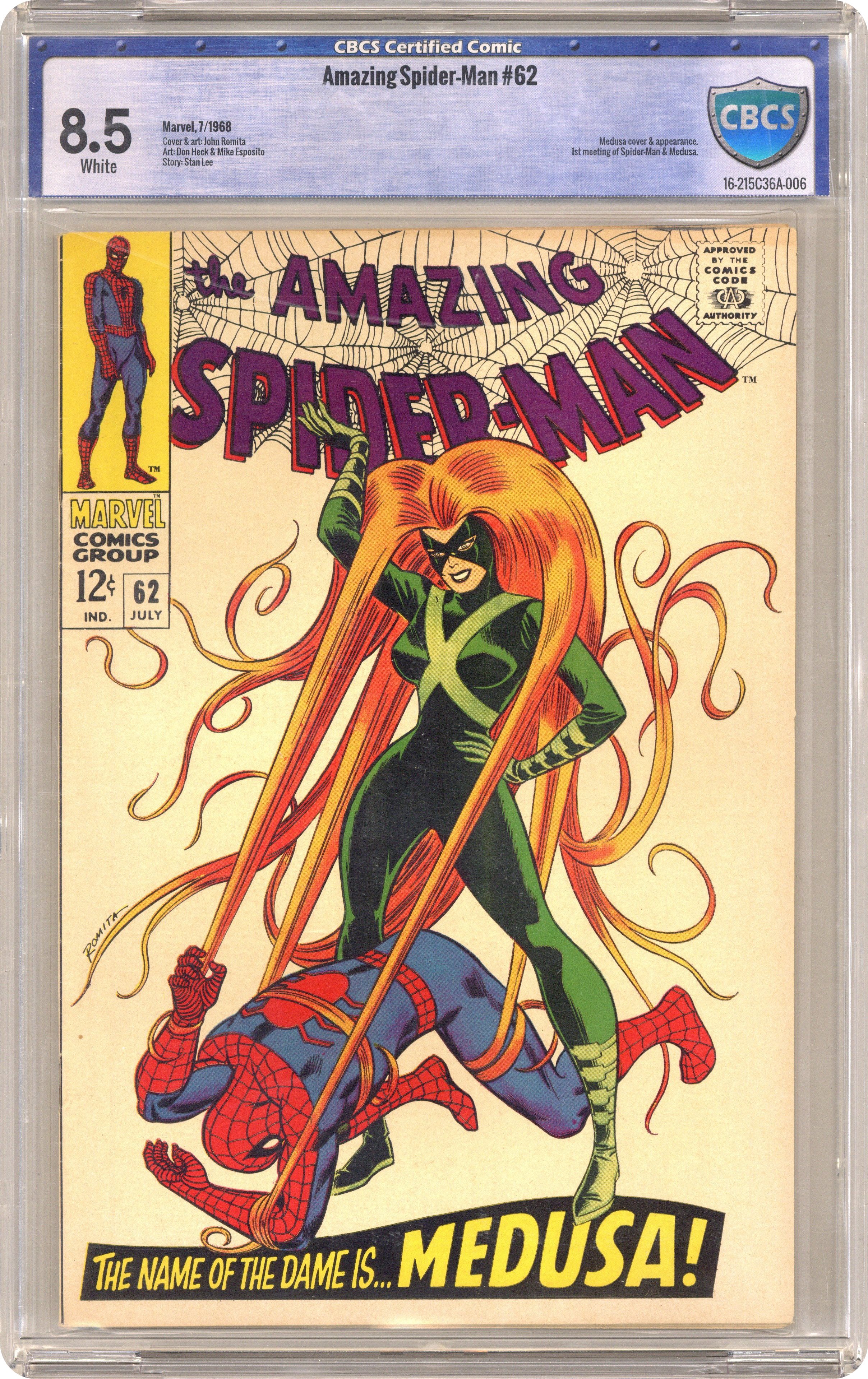 "Make Way for Medusa!" Guest-starring Medusa. Script by Stan Lee. Art by John Romita (layouts) and Don Heck (pencils). Inks by Mike Esposito (as Mickey Demeo). Cover by John Romita. The inhuman with the living red hair comes to New York City! Medusa is on a mission from Black Bolt to see how regular everyday people might relate to the Inhumans -- if they choose to rejoin society someday. Unfortunately, one of the first persons Madame Medusa meets...is the CEO of a hair spray company! The duplicitous executive tricks Spider-Man and Medusa into fighting one another (as shown on the fantastic cover) -- to support his advertising campaign! Eventually, the web-slinger and Medusa realize what's happening...and they turn the tables on the shady CEO. Cameo appearances by Captain Stacy, Gwen Stacy, Mary Jane Watson, J. Jonah Jameson, Norman Osborn, and Harry Osborn. (Notes: Spectacular Spider-Man (1968 Magazine) #1 was also published this month. The letters page includes a letter from Mark Lamberti -- long-time friend of Lone Star Comics. This issue was reprinted in Marvel Tales #45.) 36 pages. Cover price $0.12. Grade: CBCS 8.5 explanation of grade Condition: Used (collectible)
