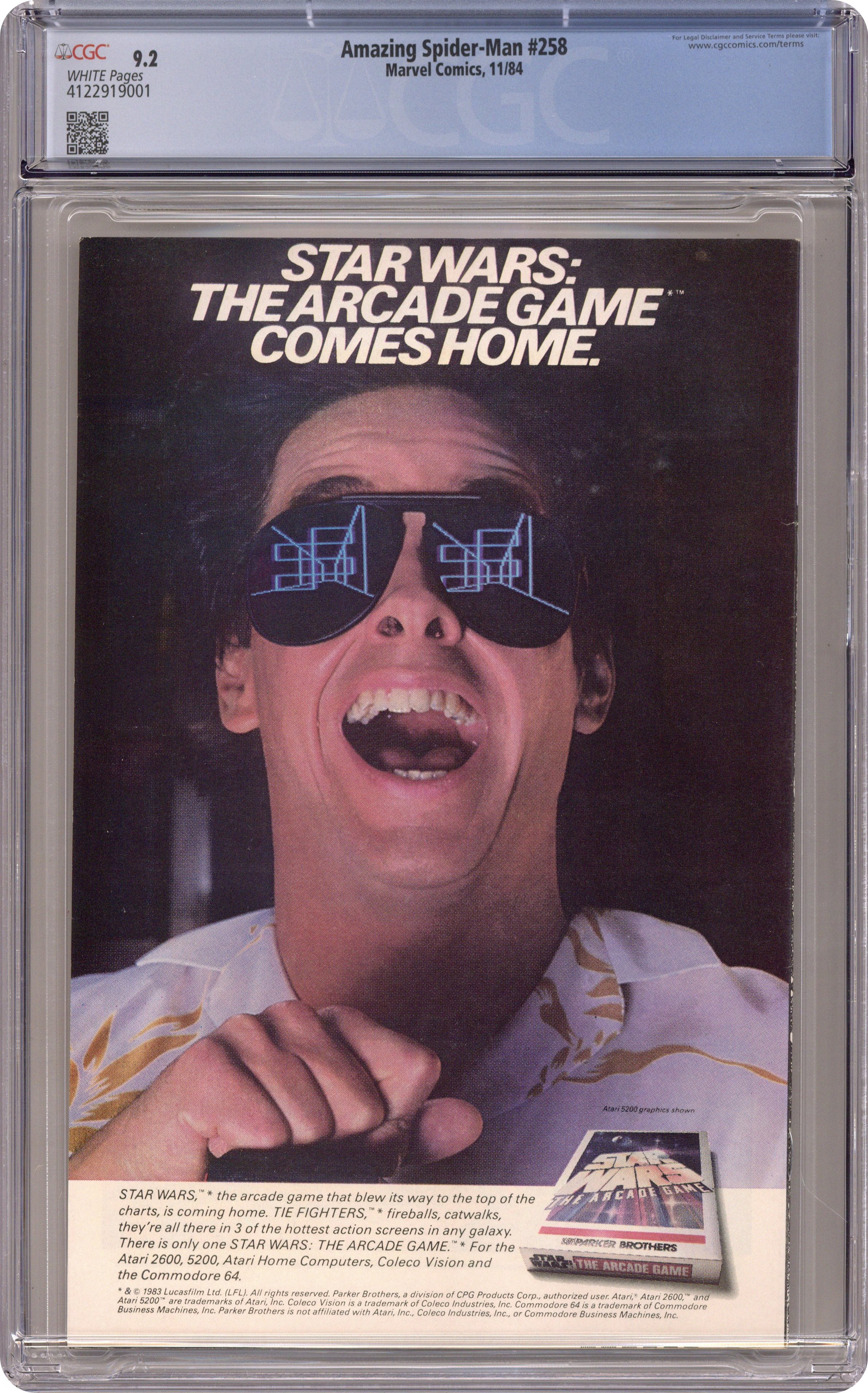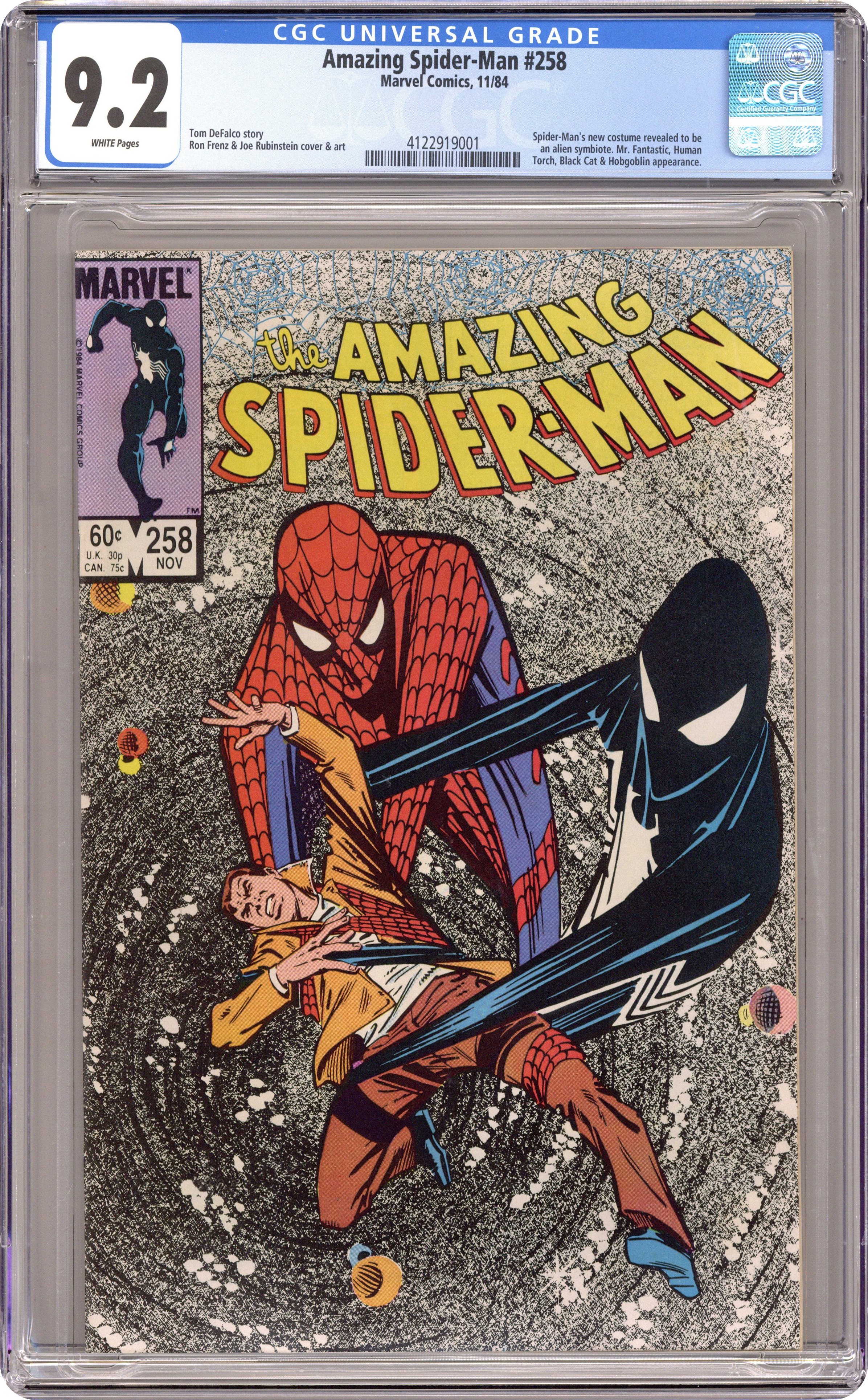Direct Edition. "The Sinister Secret of Spider-Man's New Costume!" Guest-starring Mr. Fantastic and the Human Torch. Script by Tom DeFalco. Pencils by Ron Frenz. Inks by Joe Rubinstein. Cover by Ron Frenz and Joe Rubinstein. Chaos erupts at 410 Chelsea when Mary Jane Watson and the Black Cat meet inside Peter Parker's apartment! Wow, what a shocking development! To say that the web-slinger has some explaining to do...would be the understatement of the year! After the dust settles, the wall-crawler swings over to the Baxter Building to let Reed Richards analyze his new black costume. When Spider-Man learns his costume is "alive," he tries to pull it off; but the alien symbiote has other ideas! Can the Fantastic Four help Spidey with his major wardrobe malfunction? Cameo appearances by the Rose, Hobgoblin, and Puma. (Notes: The Black Cat and Mary Jane Watson are formally introduced to one another in Spectacular Spider-Man 123. The cover does not display the typical UPC box in the lower left-hand corner. This issue was reprinted in Marvel Tales 272.) 36 pages. Cover price $0.60. Grade: CGC 9.2 explanation of grade Condition: Used (collectible)