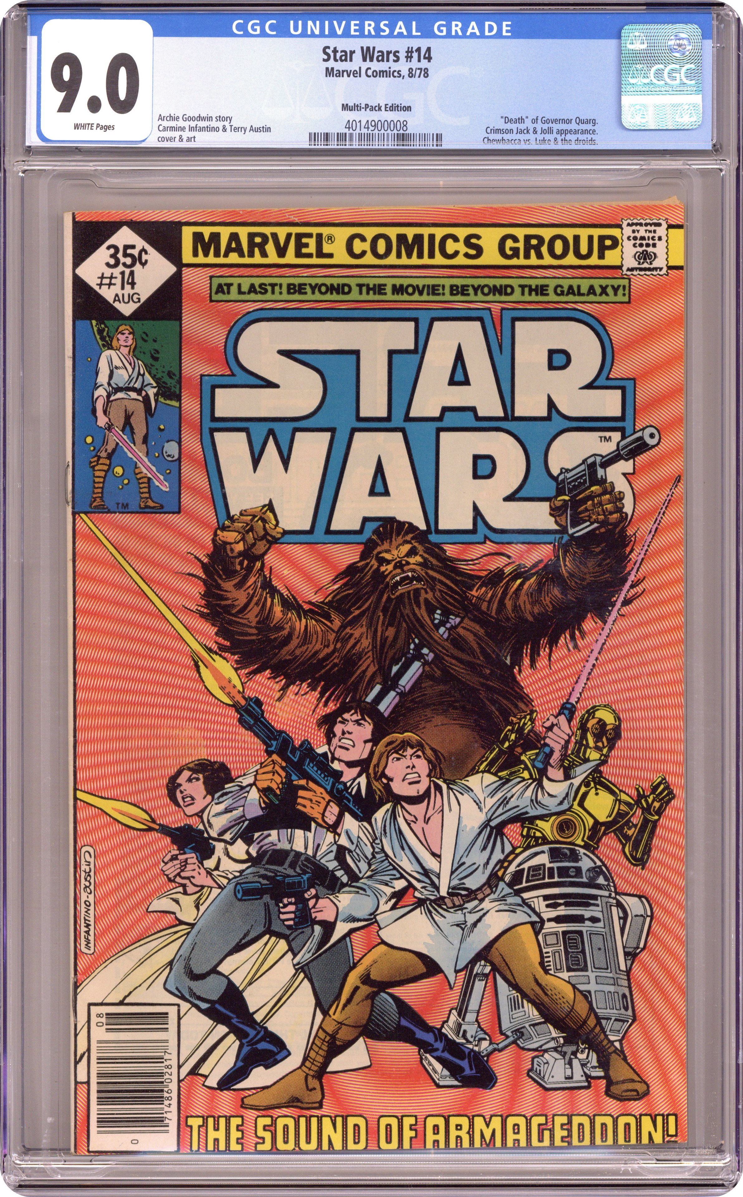 "The Sound of Armageddon!" Written by Archie Goodwin. Art by Carmine Infantino and Terry Austin. Luke, Leia, Han, and the rest battle pirates, sea monsters and each other on a dangerous and desolate waterworld. Cover price $0.35. Grade: CGC 9.0 explanation of grade Condition: Used (collectible)