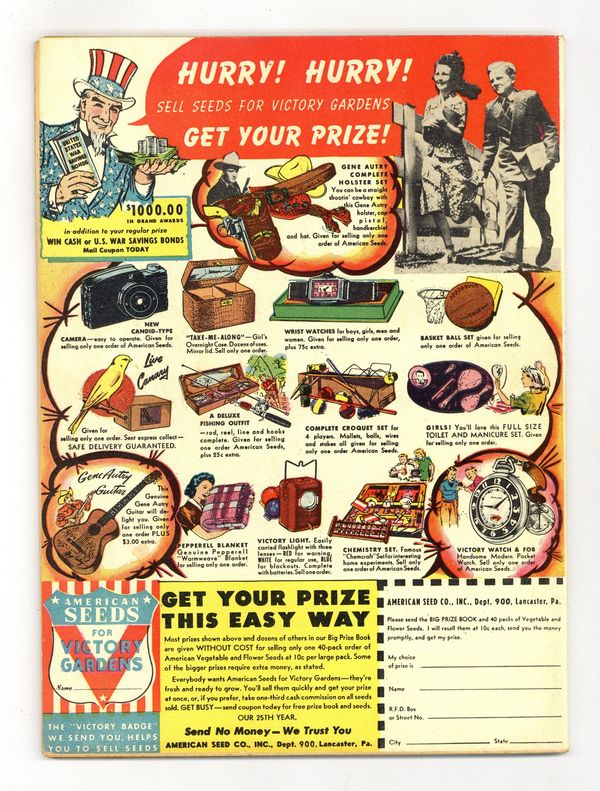 Ended Jul 16 2023 Winning Bid $865 Cover pencils by Jack Kirby, inks by Joe Simon. Crime Carnival!, script and pencils by Jack Kirby, inks by Joe Simon; Sandman and Sandy must solve a series of unusual crimes being committed by members of the Mammoth Circus, who seem to always elude members of the Police with a getaway car that converts into a truck. The Doom From the Skies, script by Gardner F. Fox, art by Emil Gershwin. Riddle of the Rodeo starring Shining Knight, script by Ruth Lyons Kaufman [as Bunny Lyons], art by Louis Cazeneuve. The Adventure of the Runaway Calculating Machine starring Genius Jones, script by Alfred Bester, art by Stan Kaye. The Adventure of the Animal Assassins starring Manhunter, script by Jack Kirby, art by Pierce Rice. The Last Time They Saw Paris starring Mike Gibbs, Guerilla, script by Joe Samachson, art by Irving Tirman. 68 Pages, Full Color. Cover price $0.10. Grade: FN+ 6.5 explanation of grade Condition: Used (collectible)
