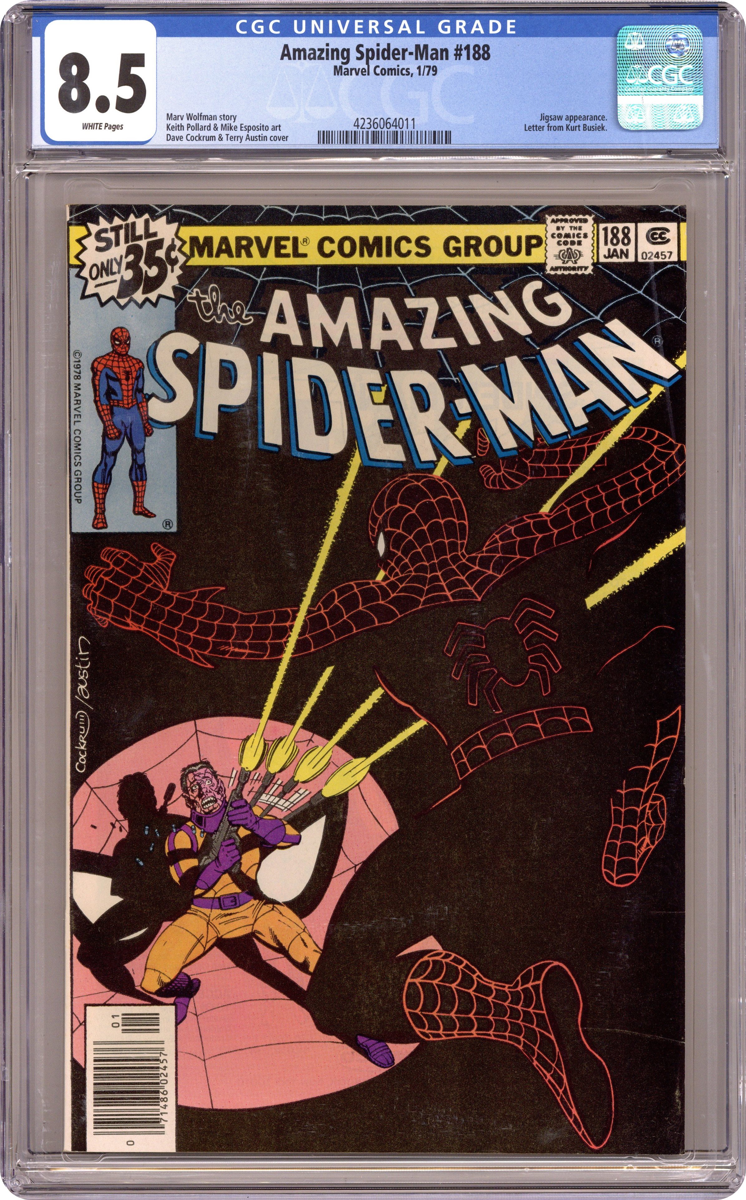 "The Jigsaw is Up!" Script by Marv Wolfman. Art by Keith Pollard (layouts) and Mike Esposito (finishes). Cover by Dave Cockrum and Terry Austin. After laying low for a few months, Jigsaw wants to return to a peaceful life of crime...by avoiding any and all super-heroes! So the disfigured hitman picks an easy target for his next caper: a midnight boat cruise around Manhattan! But poor Jigsaw doesn't know that a group of long-time friends have decided to take the boat ride too! Namely Flash, Sha Shan, Harry, Liz, Mary Jane, Betty, and Peter! Once Jigsaw grabs Harry and Liz at gunpoint, the wondrous wall-crawler swings into action! And Jigsaw's worst nightmare comes true: another clash with the Spectacular Spider-Man! Cameo appearances by John Jameson and Aunt May. (Notes: Jigsaw formerly appeared in Amazing Spiderman 162 and returns in the first issue of the Punisher Limited Series (1986). The letters page includes a lengthy letter from comics writer Kurt Busiek.) 36 pages Cover price $0.35. Grade: CGC 8.5 explanation of grade Condition: Used (collectible)