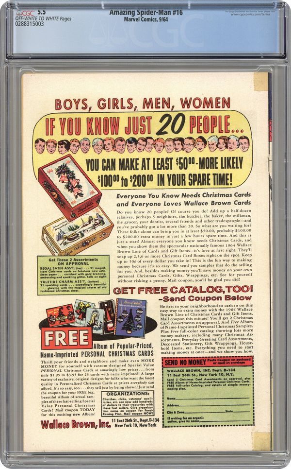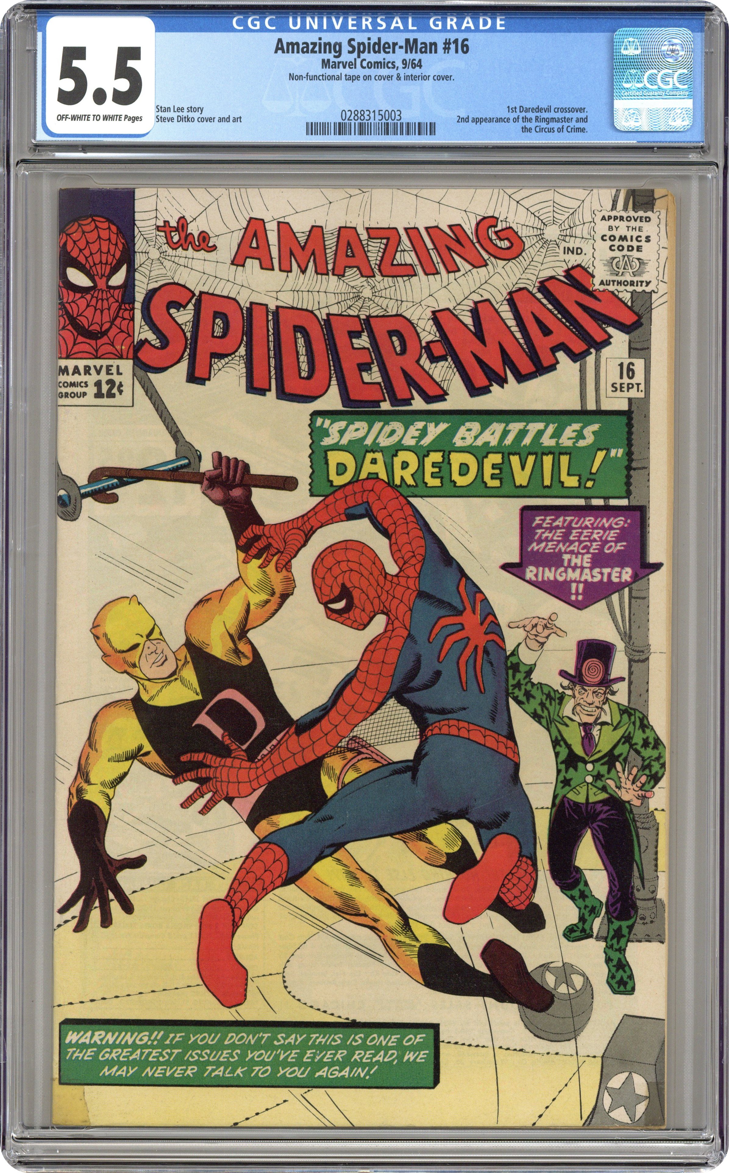 Cover art by Steve Ditko. Duel with Daredevil, script by Stan Lee, art by Steve Ditko; When the Circus of Crime comes to town, they advertise that Spider-Man will be appearing in an attempt to fill the big top before they rob it; Spider-Man sees the advertisements and decides he will show up; He is hypnotized along with the rest of the audience, but unfortunately for the Circus of Crime, the Daredevil is in attendance and immune to the Ringmaster's hat. Reprinted in Marvel Tales # 11 and 154. 36 pgs. $0.12. Cover price $0.12. Grade: CGC 5.5 explanation of grade Condition: Used (collectible)