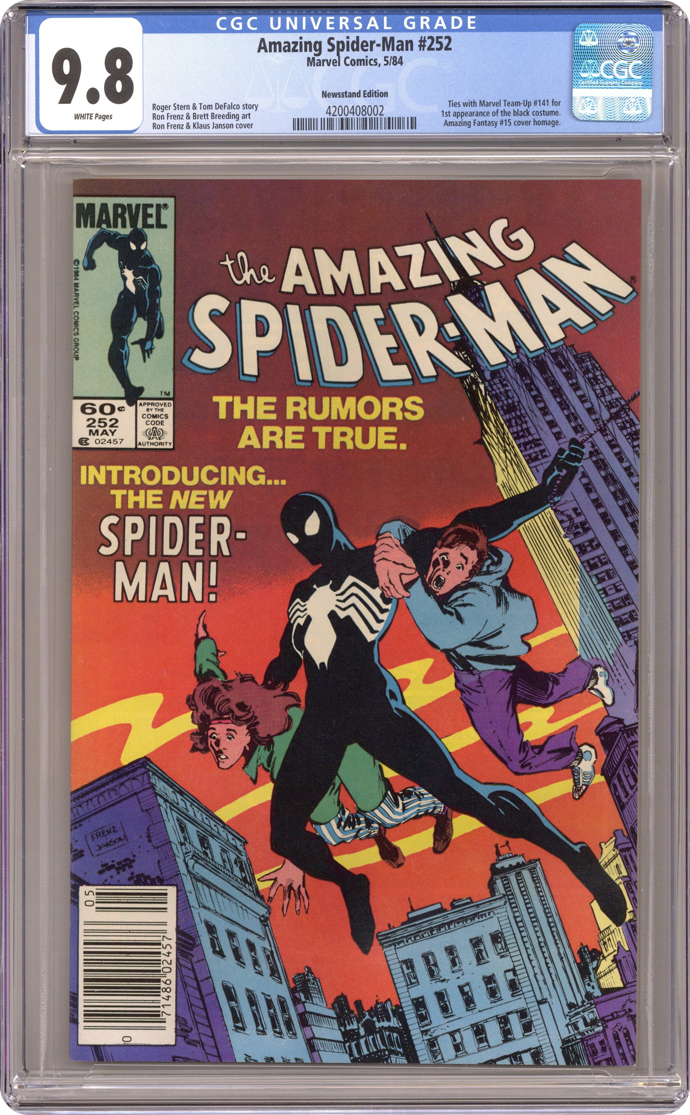 Ended Jul 31 2023 Winning Bid $1,901 Newsstand Edition. First appearance of Spider-Man's new black (alien symbiote) costume in "Homecoming!" Plot by Roger Stern. Script by Tom DeFalco. Pencils by Ron Frenz (breakdowns) and Brett Breeding (finishes). Cover by Ron Frenz and Klaus Janson. One of the landmark issues of the Amazing Spider-Man! With a brilliant flash of light in Central Park, the wondrous wall-crawler is back! And he looks a whole lot different! Wow, a new costume! What happened during the Secret Wars on the Beyonder's world? The ominous truth will be revealed to both the readers and the web-slinger in the days and weeks ahead! Cameo appearances by the Black Cat, Dr. Curt Connors, J. Jonah Jameson, Joe Robertson , Aunt May, Captain America, Captain Marvel, Hawkeye, Iron Man, Thor, and the Wasp. (Notes: Marvel Age 12 contained sketches of the new costume two months prior to the publication of this issue. Spidey's new costume was also unveiled in Marvel Team-Up 141 and Spectacular Spider-Man 90. The first issue of the (1984) Marvel Super Heroes Secret Wars Limited Series was published the same month as Amazing Spider-Man 252. The web-slinger discovers his new costume in issue 8 of the limited series. The Frenz-Janson cover is a tribute to the iconic cover of Amazing Fantasy 15. This story was reprinted in Marvel Tales 266. The letters page contains a statement of ownership: average print run 470,527; average paid circulation: 241,762. 36 pgs. Cover price $0.60. Grade: CGC 9.8 explanation of grade Condition: Used (collectible)