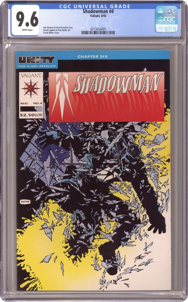 Ended May 29 2023 Winning Bid $18 UNITY Chapter 6. Shadowman finds himself side by side with Solar, sun and shadow allied against the One who sits at the center of UNITY. "Sunburn" is written by David Lapham, Jim Shooter and Faye Perozich, with art by David Lapham, Tom Ryder and Maria Beccari. Cover by Frank Miller. Cover price $2.50. Grade: CGC 9.6 explanation of grade Condition: Used (collectible)