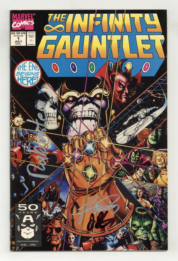 SOLD$45.00- Signed by writer Jim Starlin, artist George Perez, and inker Joe Rubenstein with Lone Star Comics certificate of authenticity.