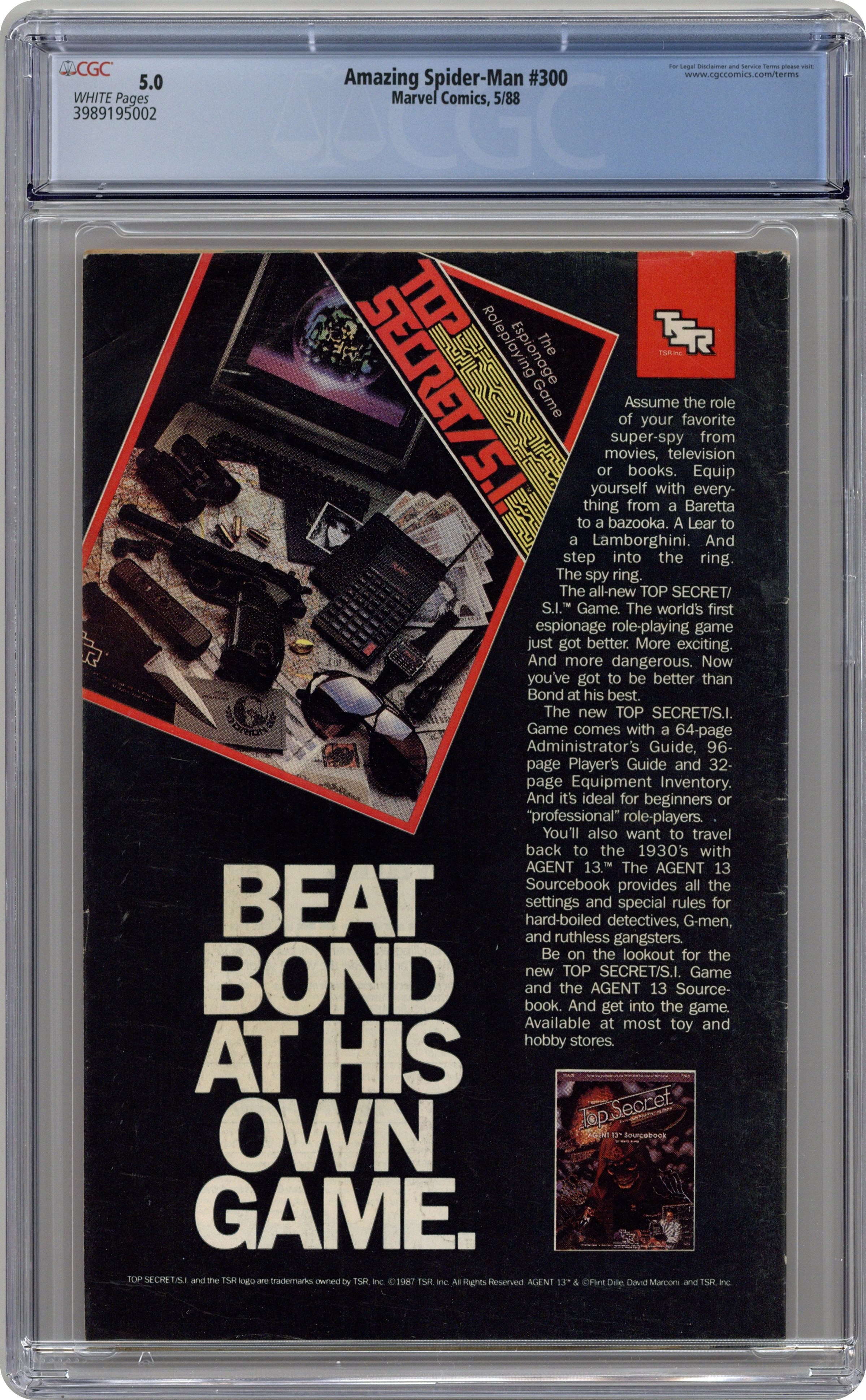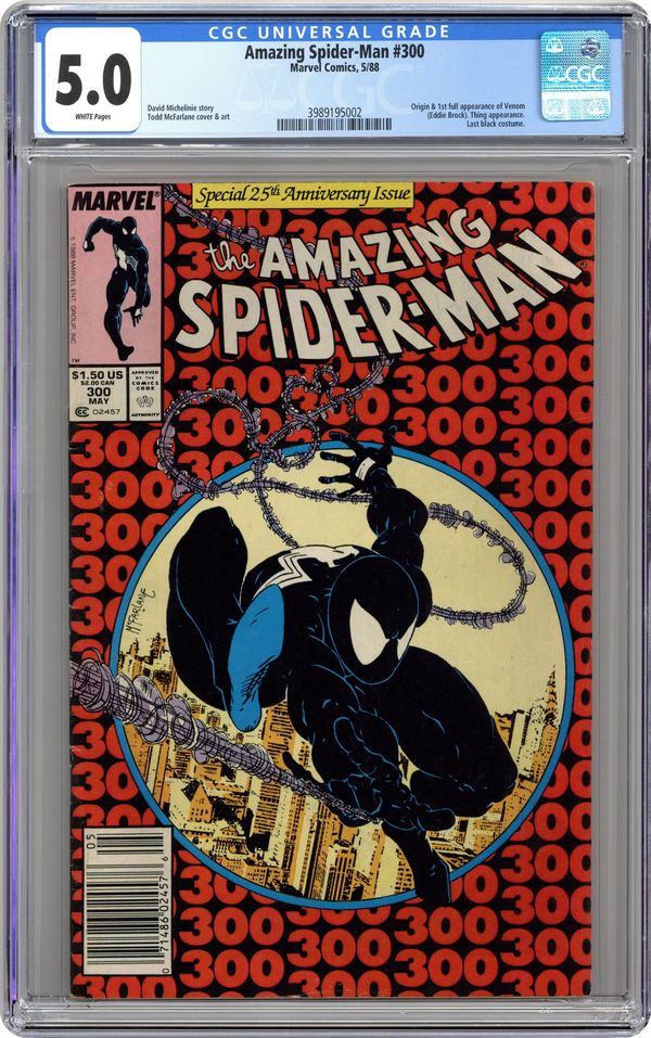 Newsstand Edition. Giant-sized 25th anniversary issue. First full appearance of Venom in "Venom!", script by David Michelinie, art by Todd McFarlane; Spidey's old alien costume has merged with reporter Eddie Brock who thinks his career was ruined by Spider-Man and the symbiote of the two, Venom, takes on the web slinger; At MJ's request, Spidey returns to the blue and red costume as she now finds his black duds way too creepy; This is the last issue in which Spider-Man appears in his black costume; Thing (of the Fantastic Four) cameo.. Stan's Soapbox Special in place of letters page: Full page editorial by Stan on the occasion of Spider-Man's 300th issue. 52 pgs., full color. Cover price $1.50. Grade: CGC 5.0 explanation of grade Condition: Used (collectible)
