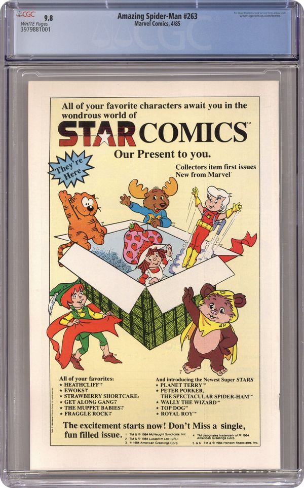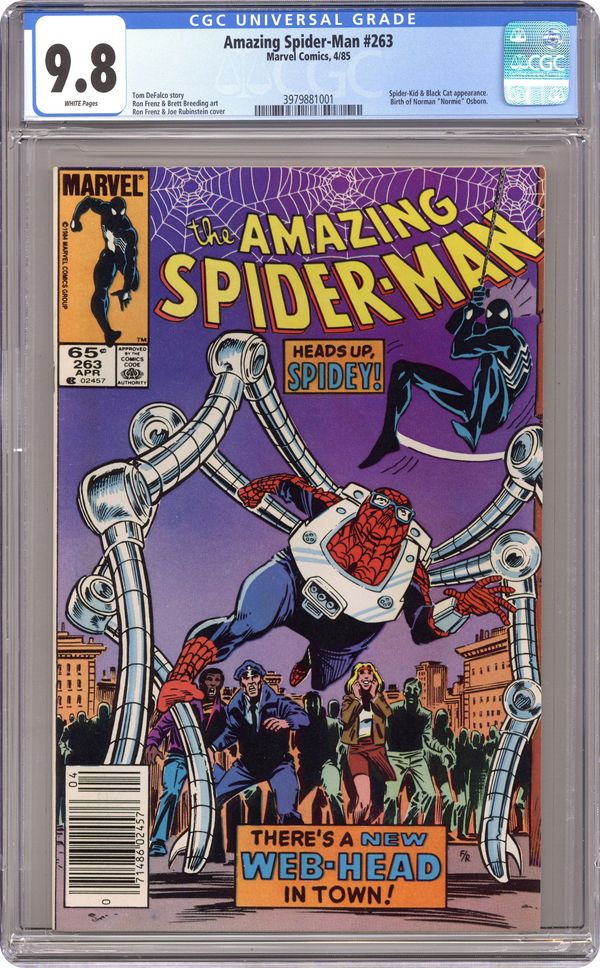 "The Spectacular Spider-Kid!" Script by Tom DeFalco. Pencils by Ron Frenz. Inks by Brett Breeding and John Beatty. Cover by Ron Frenz and Joe Rubinstein. Ollie Osnick is back! And this time with a brand new moniker: the Spectacular Spider-Kid! In his own red and blue costume with mechanical arms, the Spider-Kid patrols the dangerous streets of New York City to fight crime! But once the novice superhero runs afoul of a local street gang, he needs help from his favorite web-slinger! Will the real wall-crawler pull Ollie's fat out of the fire one more time? Meanwhile at the hospital, Harry Osborn anxiously awaits the birth of his son. First appearance of Normie Osborn. Cameo appearances by Liz (Allan) Osborn, Mary Jane Watson, and the Black Cat. First 65ยข issue. (Notes: Ollie Osnick previously appeared in Spectacular Spider-Man 72. Spider-Man dons his black (non-symbiote) costume in this issue. The first issue of the Web of Spider-Man (1st) series was also published this month. This issue was reprinted in Marvel Tales 276.) 32 pages. Cover price $0.65. Grade: CGC 9.8 explanation of grade Condition: Used (collectible)