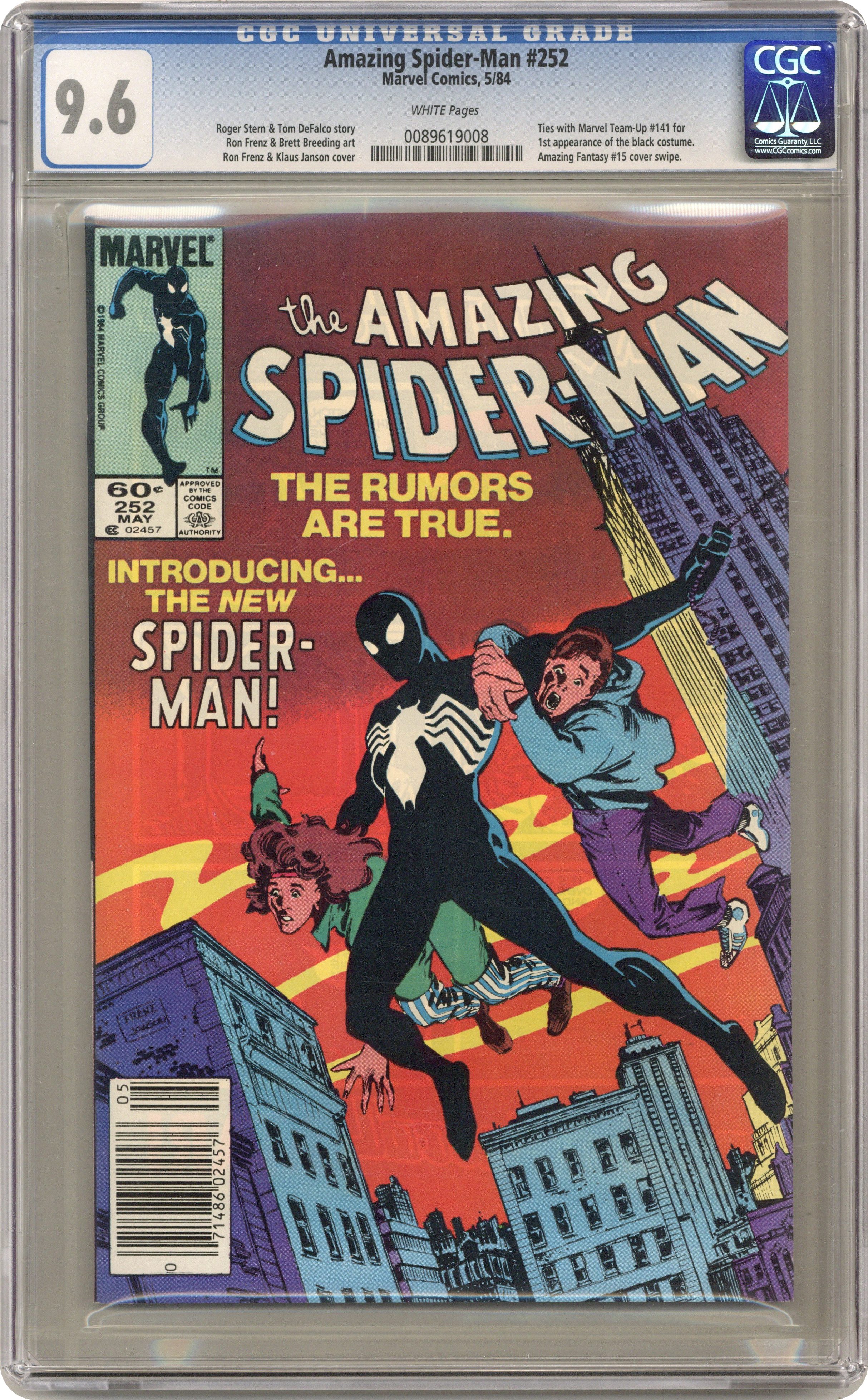 Ended Jun 12 2023 Winning Bid $511 Newsstand Edition. First appearance of Spider-Man's new black (alien symbiote) costume in "Homecoming!" Plot by Roger Stern. Script by Tom DeFalco. Pencils by Ron Frenz (breakdowns) and Brett Breeding (finishes). Cover by Ron Frenz and Klaus Janson. One of the landmark issues of the Amazing Spider-Man! With a brilliant flash of light in Central Park, the wondrous wall-crawler is back! And he looks a whole lot different! Wow, a new costume! What happened during the Secret Wars on the Beyonder's world? The ominous truth will be revealed to both the readers and the web-slinger in the days and weeks ahead! Cameo appearances by the Black Cat, Dr. Curt Connors, J. Jonah Jameson, Joe Robertson , Aunt May, Captain America, Captain Marvel, Hawkeye, Iron Man, Thor, and the Wasp. (Notes: Marvel Age 12 contained sketches of the new costume two months prior to the publication of this issue. Spidey's new costume was also unveiled in Marvel Team-Up 141 and Spectacular Spider-Man 90. The first issue of the (1984) Marvel Super Heroes Secret Wars Limited Series was published the same month as Amazing Spider-Man 252. The web-slinger discovers his new costume in issue 8 of the limited series. The Frenz-Janson cover is a tribute to the iconic cover of Amazing Fantasy 15. This story was reprinted in Marvel Tales 266. The letters page contains a statement of ownership: average print run 470,527; average paid circulation: 241,762. 36 pgs. Cover price $0.60. Grade: CGC 9.6 explanation of grade Condition: Used (collectible)