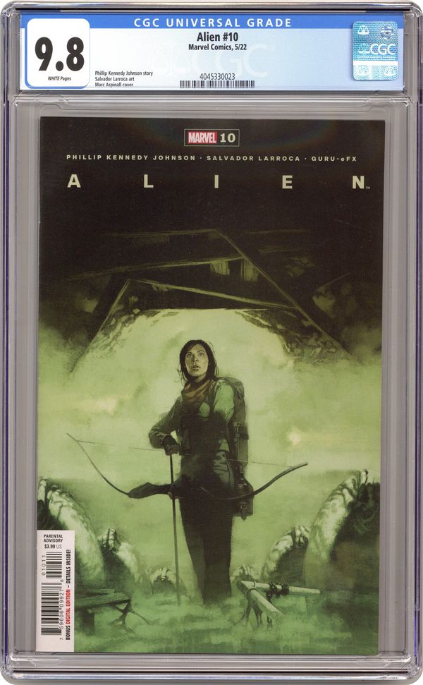 Ended Jun 13 2023 Winning Bid $19 Written by Phillip Kennedy Johnson. Art by Salvador Larroca. Cover by Marc Aspinall. The Spinners community has been decimated by the Xenomorphs. There's only a handful of survivors left. Will they make it to sanctuary? And what new terrifying type of Xenomorph awaits them? 28 pages, full color. Parental Advisory Cover price $3.99. Grade: CGC 9.8 explanation of grade Condition: Used (collectible)