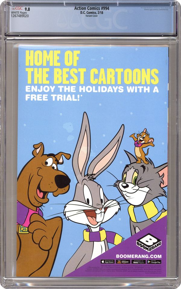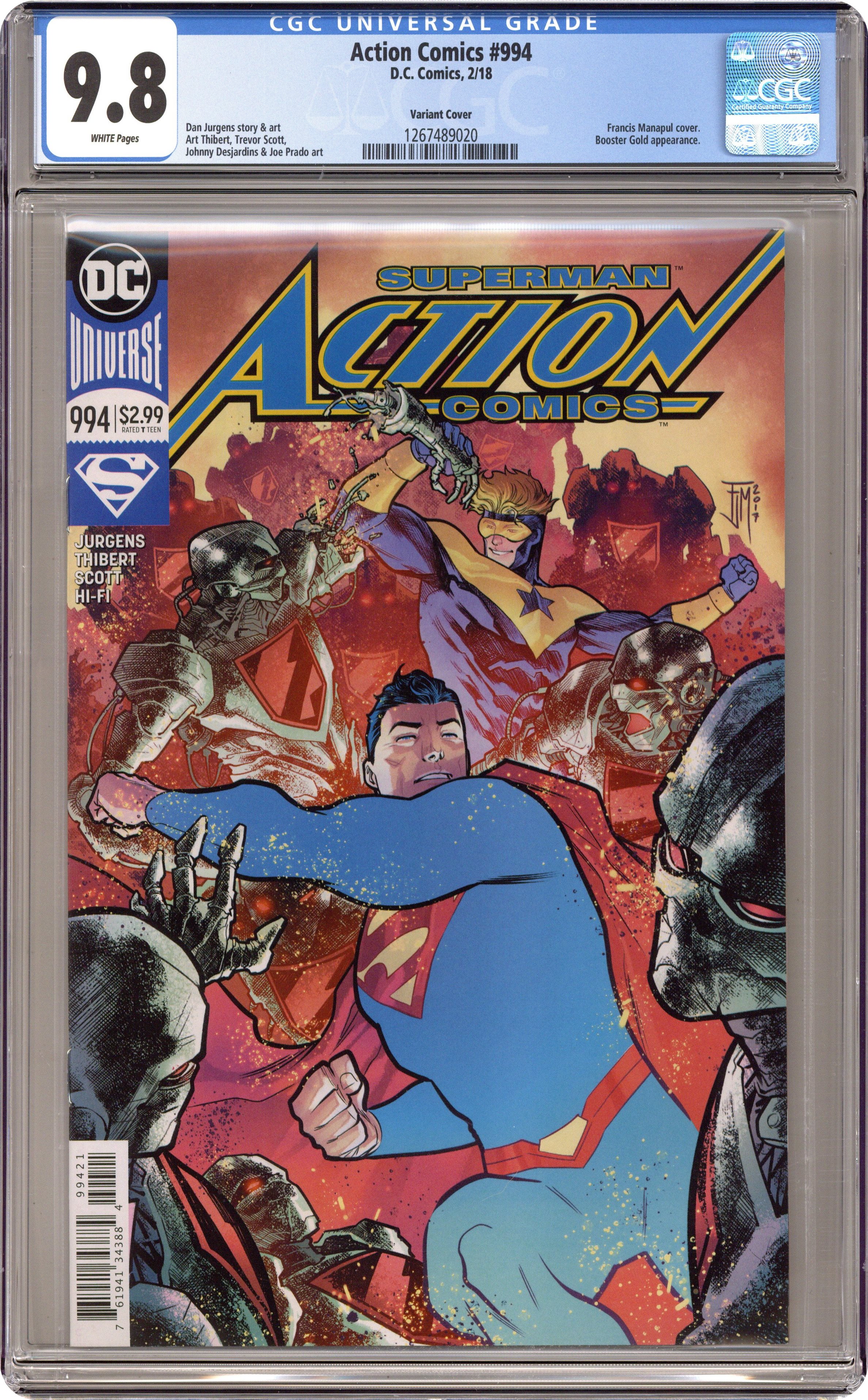 Written by Dan Jurgens. Art by Dan Jurgens, Art Thibert, Trevor Scott, Johnny Desjardins and Joe Prado. Cover by Francis Manapul. 'BOOSTER SHOT' part two! It's the time-hopping team-up of Superman and Booster Gold-and on their quest to verify Mr. Oz's identity, a mysterious force attempts to sabotage the journey! This time (pun!) our heroes wind up in the crosshairs of a deadly new villain-the time wraith responsible for their tumultuous journey! 32 pages, full color. Rated T Cover price $2.99. Grade: CGC 9.8 explanation of grade Condition: Used (collectible)