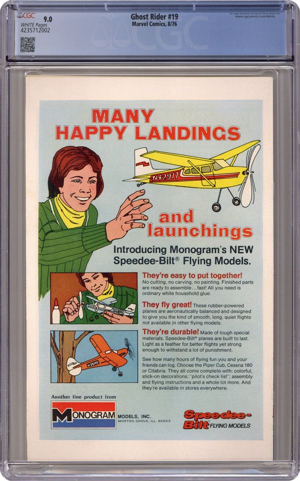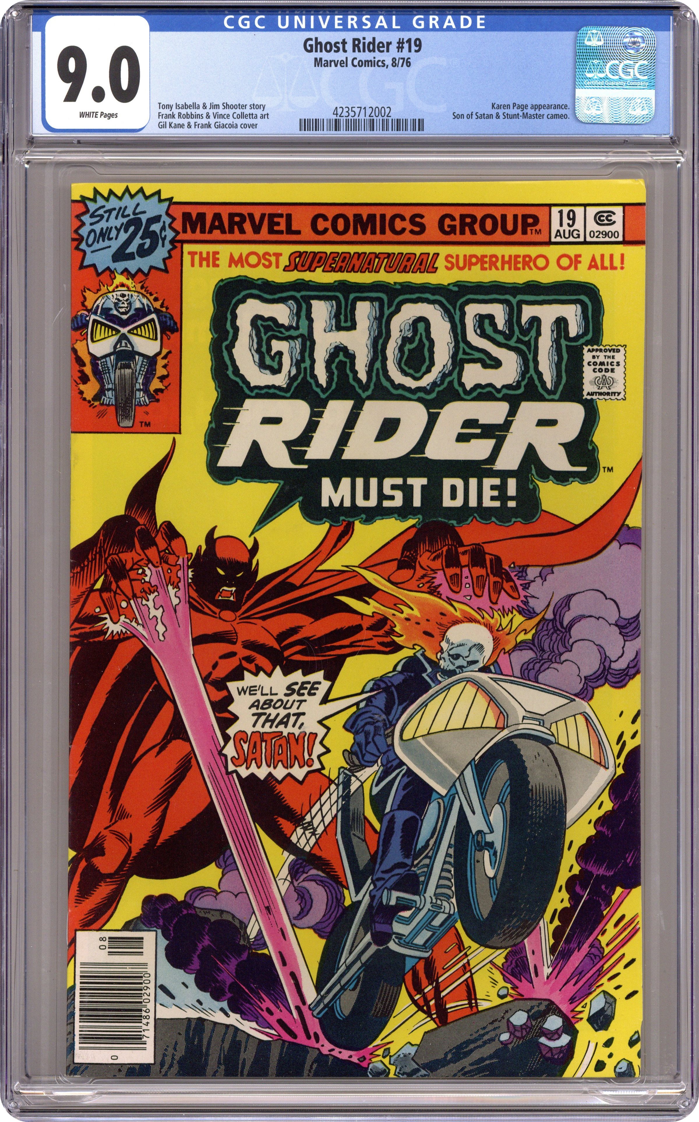 Last 25c cover-priced issue - Part 3 of 5 - "Resurrection!" Guest-Starring Daimon Hellstrom (Son of Satan) and Stunt Master. Story by Tony Isabella and Jim Shooter. Art by Frank Robbins and Vince Colletta. Cover by Gil Kane and Frank Giacoia. Can it be true?! Ghost Rider defeated and Johnny Blaze's soul forfeit? Plus, why has Stunt master betrayed Karen Page? The plot thickens in another macabre chapter of Ghost Rider! Story continues in Daredevil (1964-1998 1st Series) #138. 32 pages, FC. Cover price $0.25. Grade: CGC 9.0 explanation of grade Condition: Used (collectible)