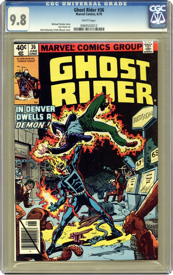 Ended Jun 12 2023 Winning Bid $240 Direct Edition. First 40c cover-priced issue - "A Demon in Denver!" Story by Michael Fleisher. Art by Don Perlin. Cover by Bob Budianski and Bob Wiacek. Johnny Blaze learns that some days it's just not easy being the Ghost Rider. Spider-Man stars in Hostess ad " Hotshot on the Block!" Cover price $0.40. Grade: CGC 9.8 explanation of grade Condition: Used (collectible)
