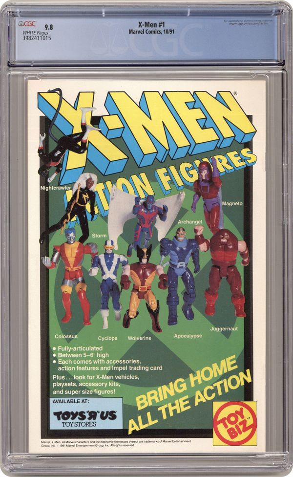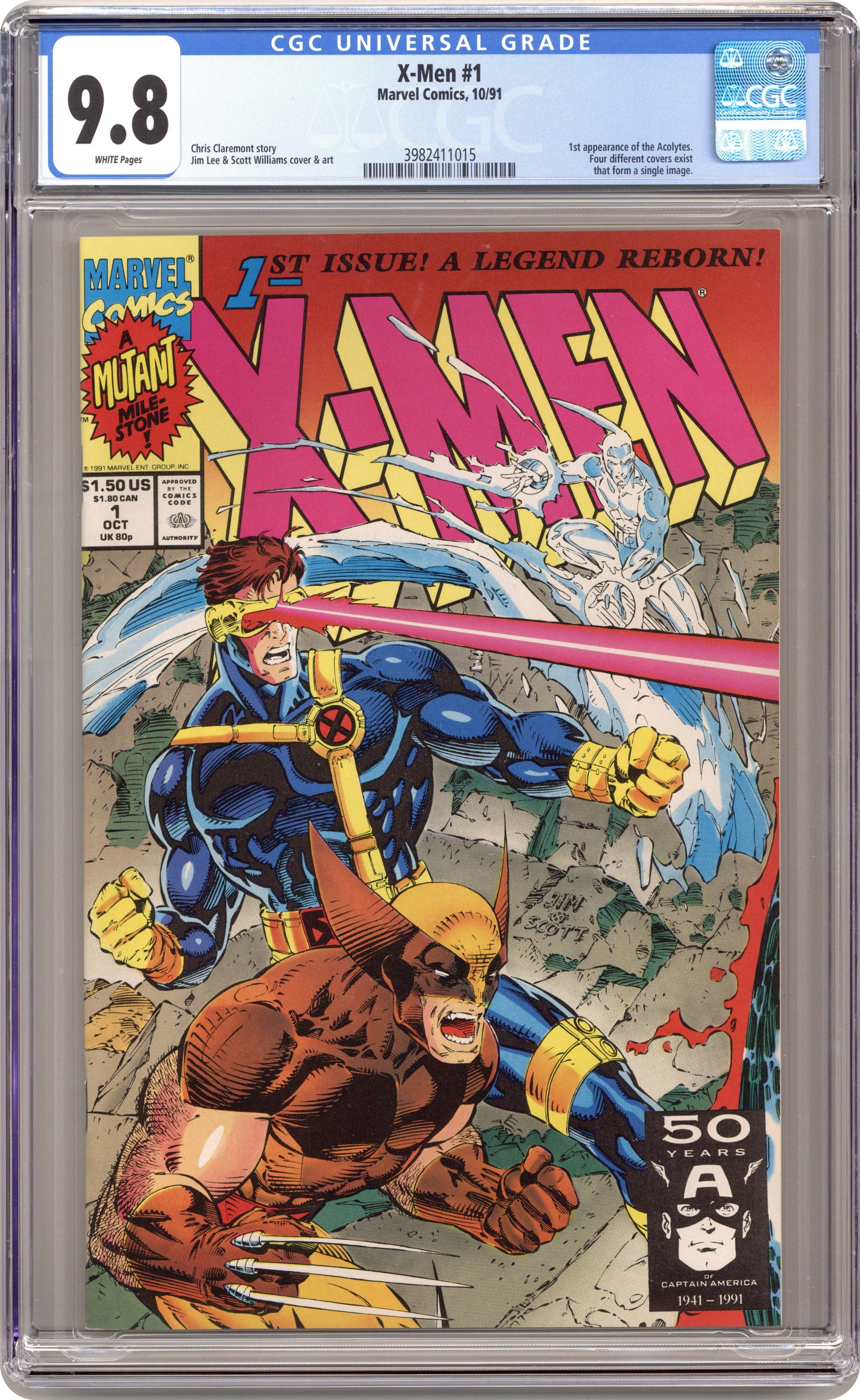 Direct Edition. Cyclops/Wolverine/Iceman cover. Cover pencils by Jim Lee, inks by Scott Williams. Rubicon, script by Jim Lee (Co-Plot) and Chris Claremont, pencils by Jim Lee, inks by Scott Williams; Magneto forms the Acolytes and proclaims Asteroid M a haven for mutants everywhere; But the rest of the world doesn't see it that way; Nick Fury cameo. 2-page pin-up: gallery of X-Men villains. X-Men Sketchbook by Jim Lee. Cover price $1.50. NOTE: Cover C connects to covers 1A, 1B, and 1D to form a single giant image. Cover price $1.50. Grade: CGC 9.8 explanation of grade Condition: Used (collectible)