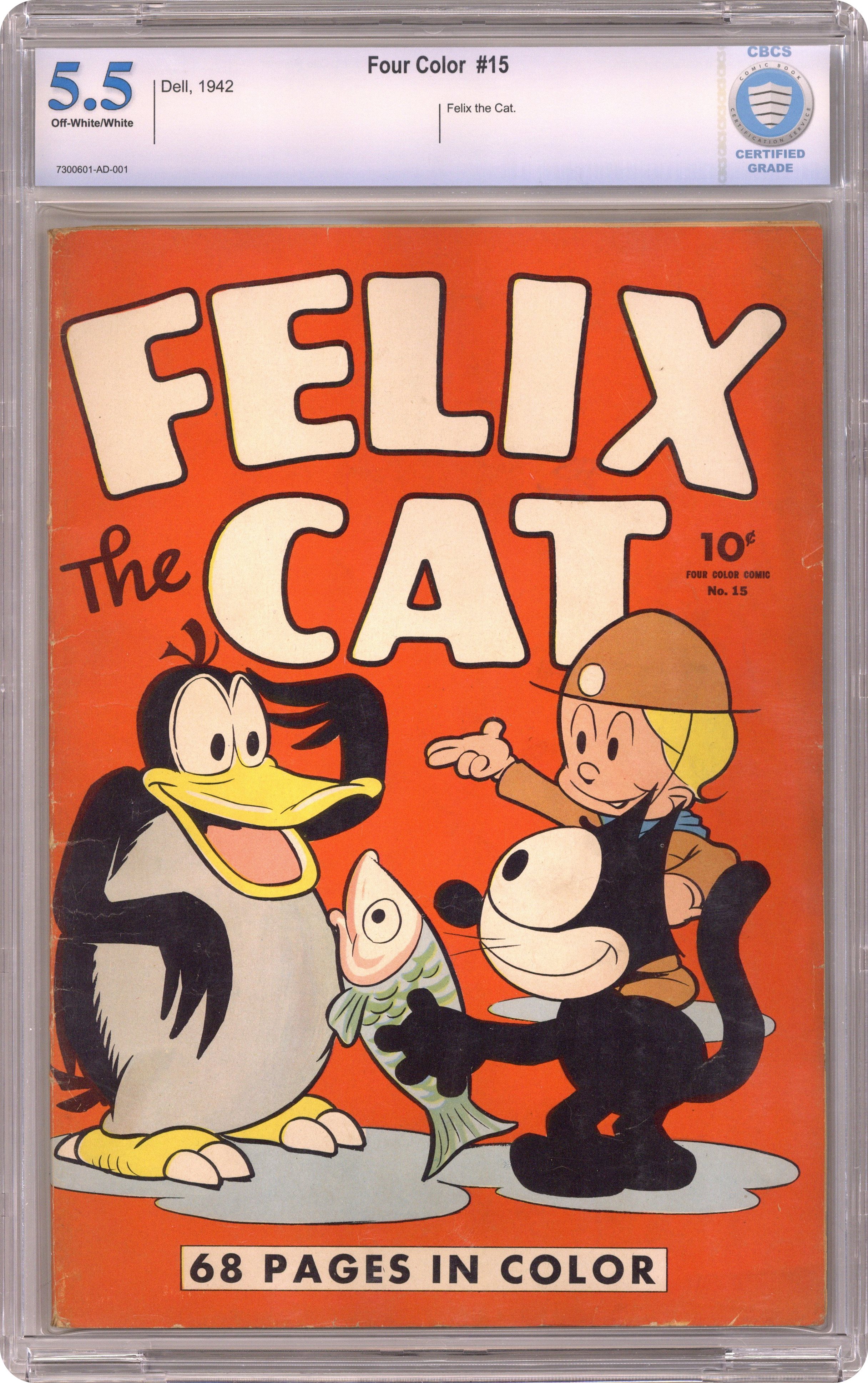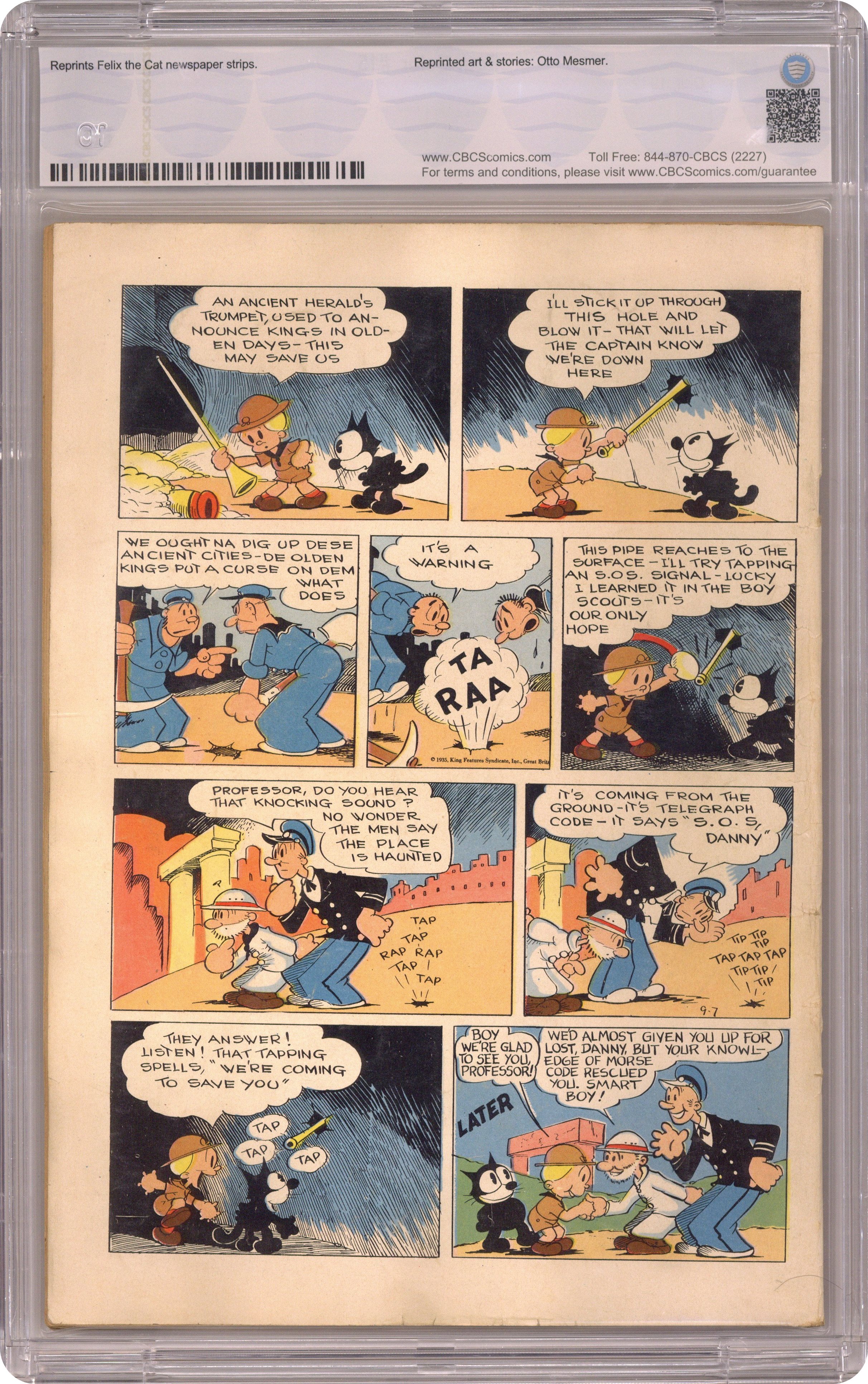 Ended Jul 14 2023 Winning Bid $210 Indicia title is "FELIX THE CAT, No. 15." Introduction of Felix the Cat, Danny Dooit, Professor Bop, Tuffy Spinacker, and The Captain. Untitled Felix the Cat story, script and art by Otto Mesmer; Felix and Danny go on a sailing expedition that discovers an island inhabited by strange beasts. Reprinted from Felix the Cat (King Features Syndicate) newspaper strips from 1935. 68 pages, full color. Cover price $0.10. Grade: CBCS 5.5 explanation of grade Condition: Used (collectible)