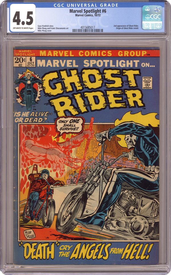 Cover art by Mike Ploog. Angels From Hell, script by Gary Friedrich, pencils by Mike Ploog, inks by Frank Chiaramonte; Ghost Rider battles a gang of bikers called Satans Saints; after GR defeats them, their leader asks him to join the club; 2nd appearance of Ghost Rider (origin retold). 36 pages, full color. Cover price $0.20. Grade: CGC 4.5 explanation of grade Condition: Used (collectible)