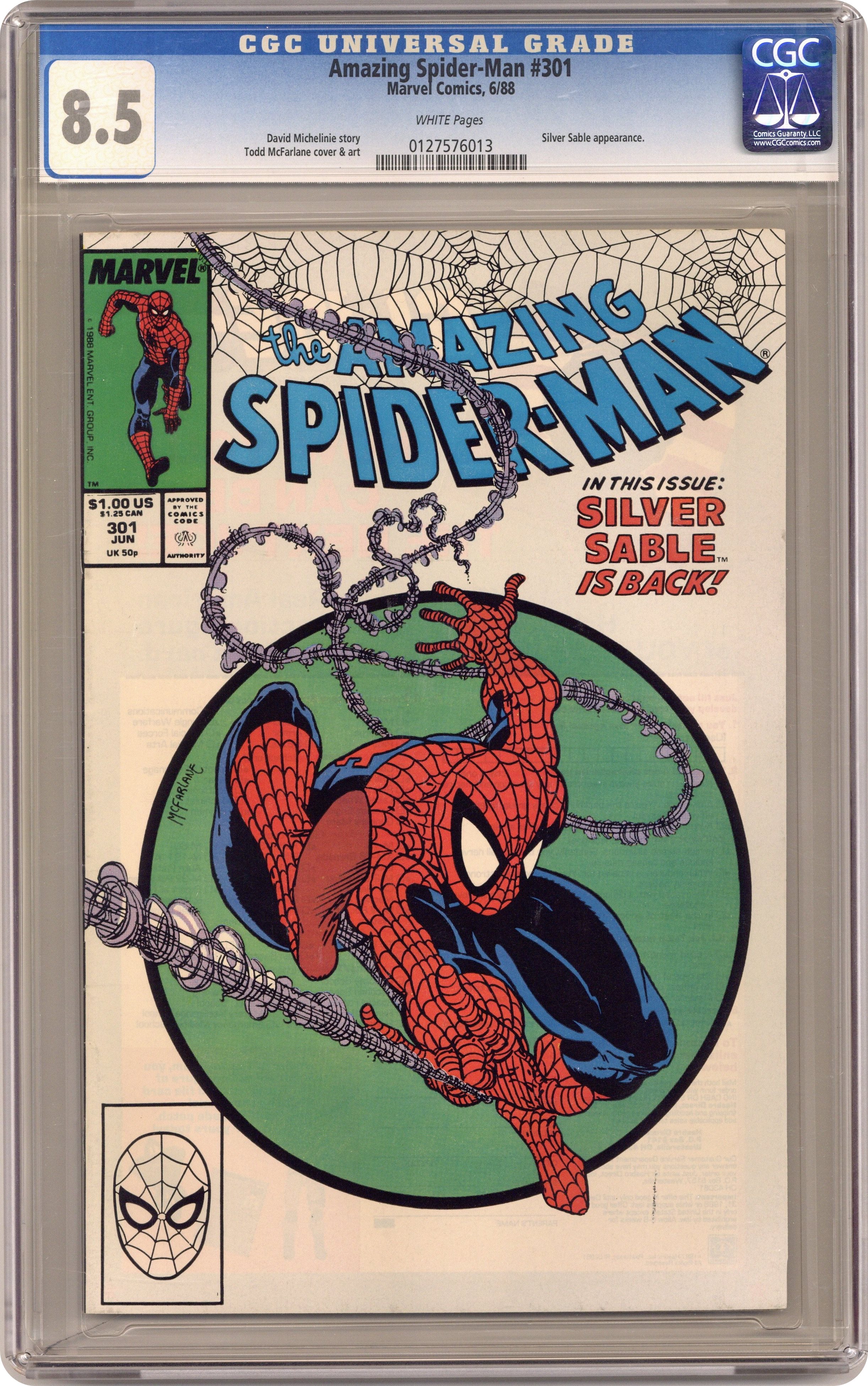 Direct Edition. "The Sable Gauntlet!" Guest-starring Silver Sable. Script by David Michelinie. Art by Todd McFarlane. Cover by Todd McFarlane. The first 300 issues of the Amazing Spider-Man are in the books after the web-slinger's epic battle vs. Venom last issue! And now the next chapter in the wall-crawler's anthology begins with an encounter with his favorite mercenary: Silver Sable! The enchanting sable agrees to make a test run through the security systems of a new high-rise office building, but deadly danger awaits on the top floor! Will Spidey catch the elevator in time? Cameo appearances by Mary Jane Watson and Dr. Morris Sloan. First $1.00 issue. (Notes: The cover is the same artwork (with different colors) as the cover to issue 300. This issue includes a full-page ad for the first appearance of Typhoid Mary in the Daredevil (1st) series -- art by John Romita Jr. and Al Williamson. The letters page contains a statement of ownership: average print run 469,913; average paid circulation 284,692. 36 pgs. Cover price $1.00. Grade: CGC 8.5 explanation of grade Condition: Used (collectible)