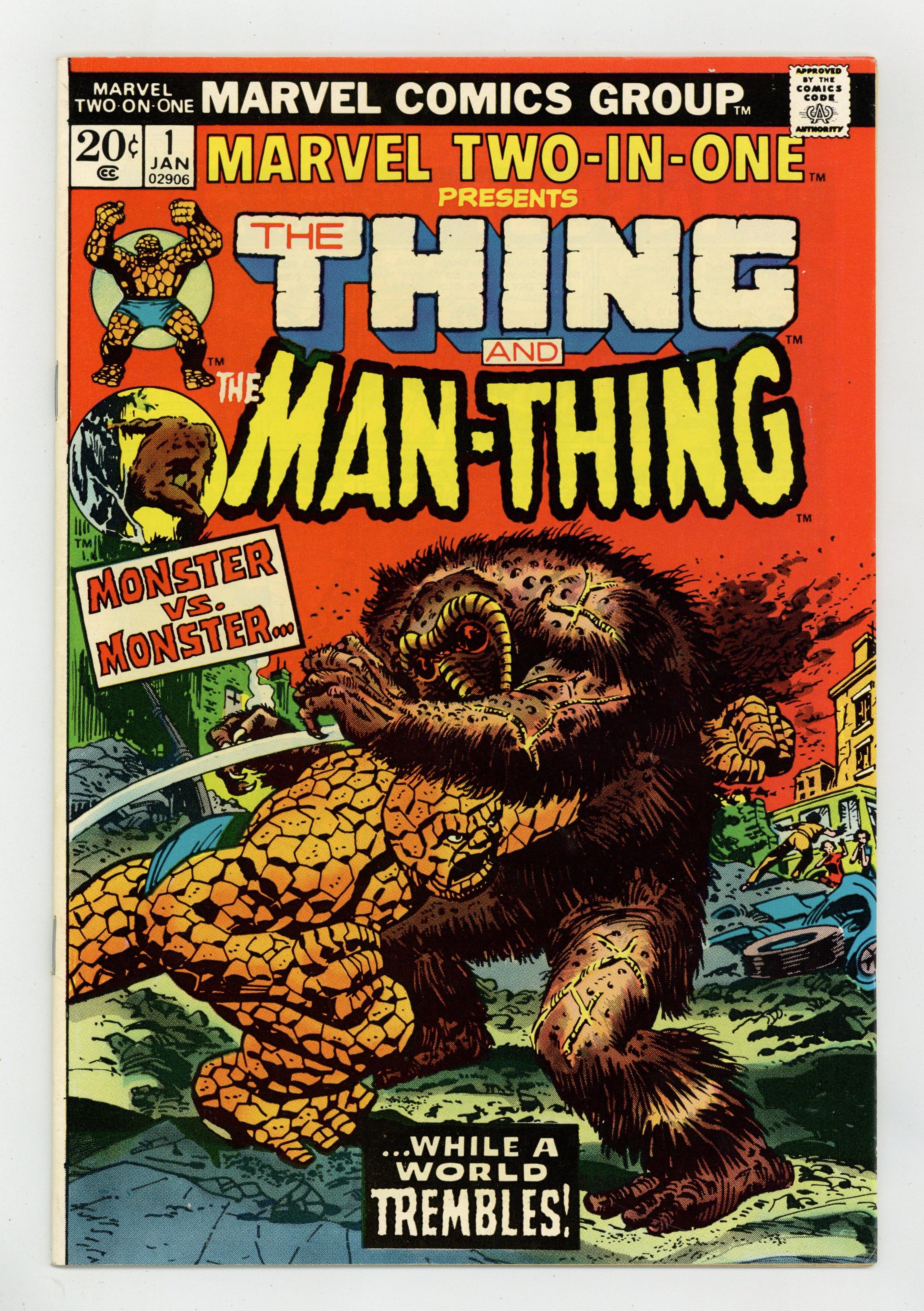 Cover by Gil Kane and John Romita, Sr. "Vengeance of the Molecule Man!" Script by Steve Gerber, pencils by Gil Kane, inks by Joe Sinnott. Mr. Fantastic, Human Torch, Hulk, and Iron Man cameos. It's monster vs. monster as the ever-lovin' blue-eyed Thing battles the macabre Man-Thing. Plus, the malevolent Molecule Man shows up to make things even worse for our rocky hero. Cover price $0.20. Grade: FN+ 6.5 explanation of grade Condition: Used (collectible)