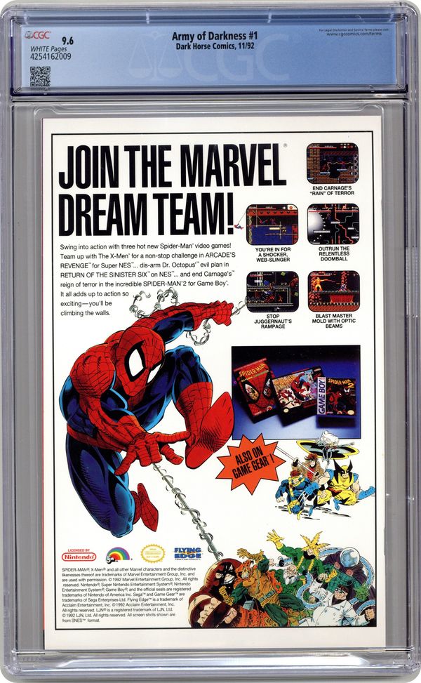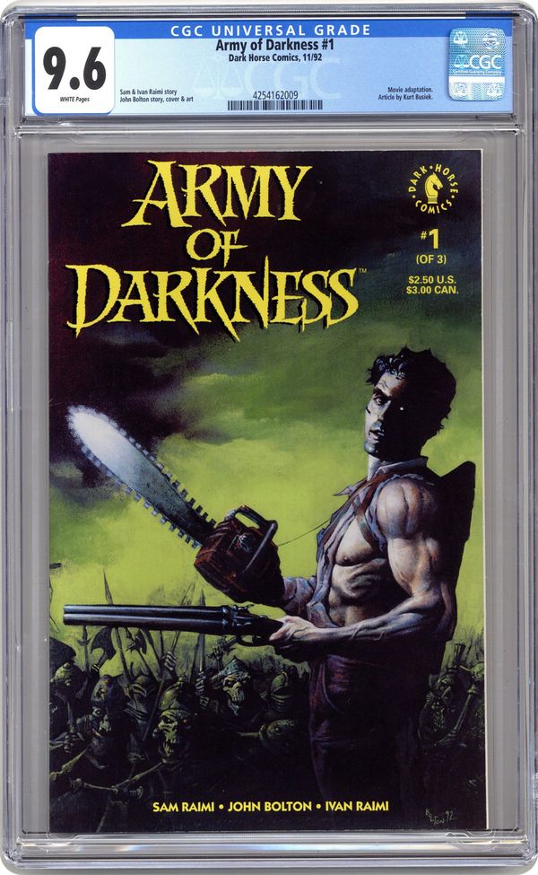 Written by Sam Raimi and Ivan Raimi. Art and cover by John Bolton. "Who's laughing now?" Not Ash, the hero of Sam Raimi's cult-classic film Evil Dead II. Armed with his chainsaw and shotgun, Ash finds himself stranded in the Middle Ages battling the resurrected armies of the dead! 32 pages, FC. Cover price $2.50. Grade: CGC 9.6 explanation of grade Condition: Used (collectible)