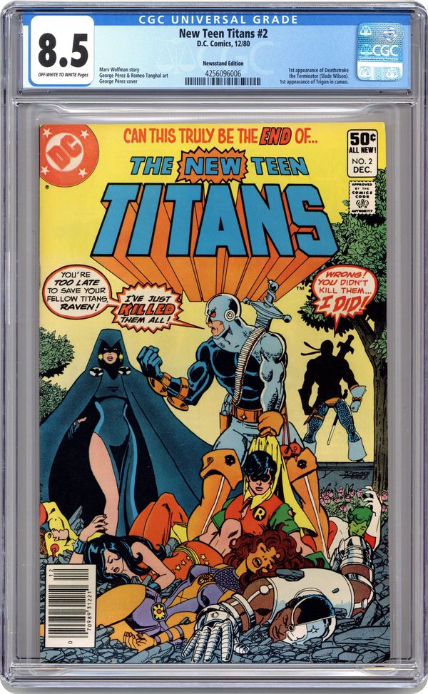 Ended Oct 2 2023 Winning Bid $105 Direct Edition. First appearance of Deathstroke the Terminator in "Today...the Terminator!" Characters: Teen Titans [Robin; Kid Flash; Wonder Girl; Cyborg; Starfire; Raven; Changeling]; The Terminator [Slade Wilson] (1st; Later Deathstroke); The Ravager [Grant Wilson] (Intro; Death); Wintergreen (Intro); HIVE. Script by Marv Wolfman, with art by George Perez and Romeo Tanghal. Plus: an article by Marv Wolfman on the revival of the Teen Titans. Cover by George Perez. Cover price $0.50. Grade: CGC 8.5 explanation of grade Condition: Used (collectible)