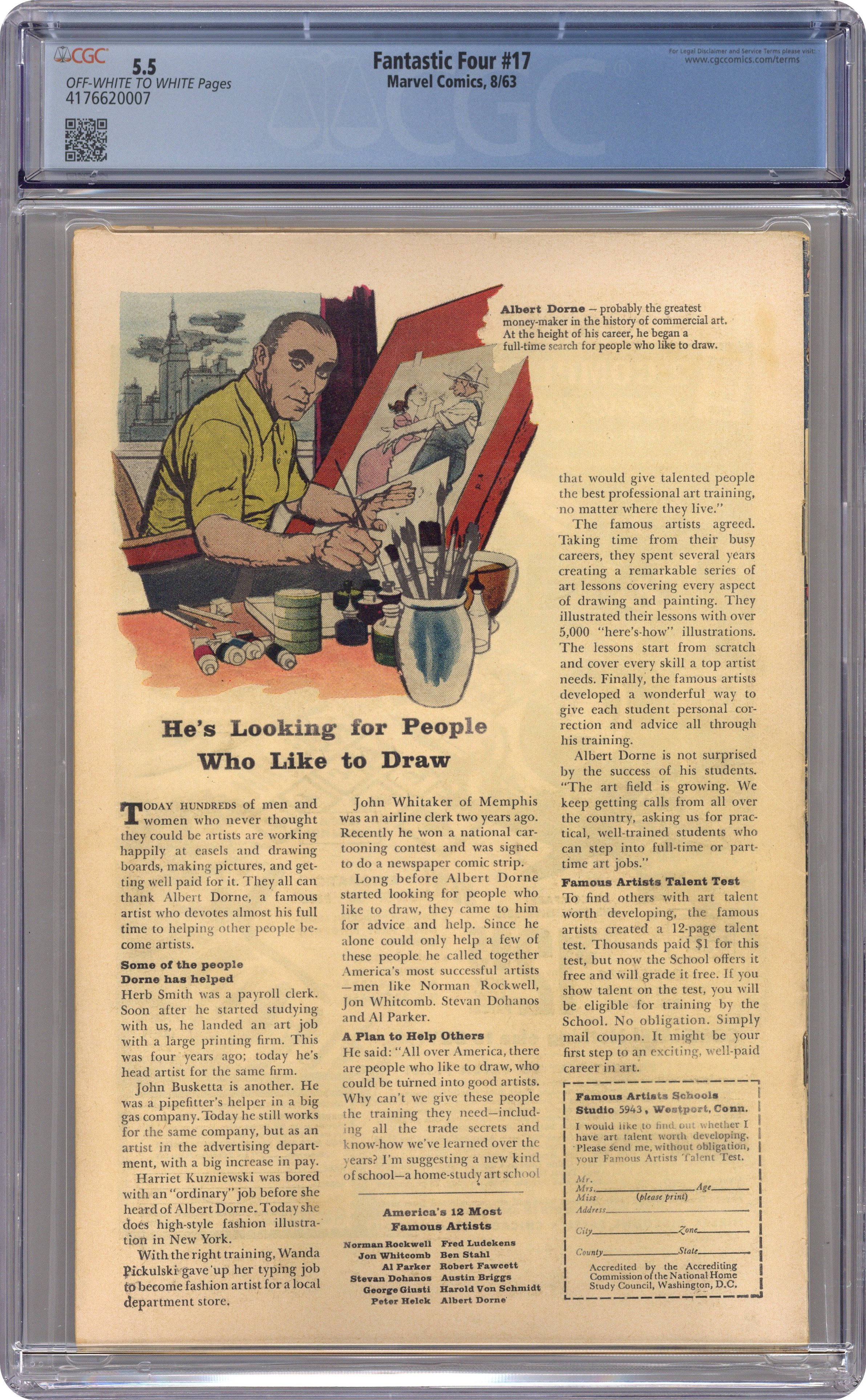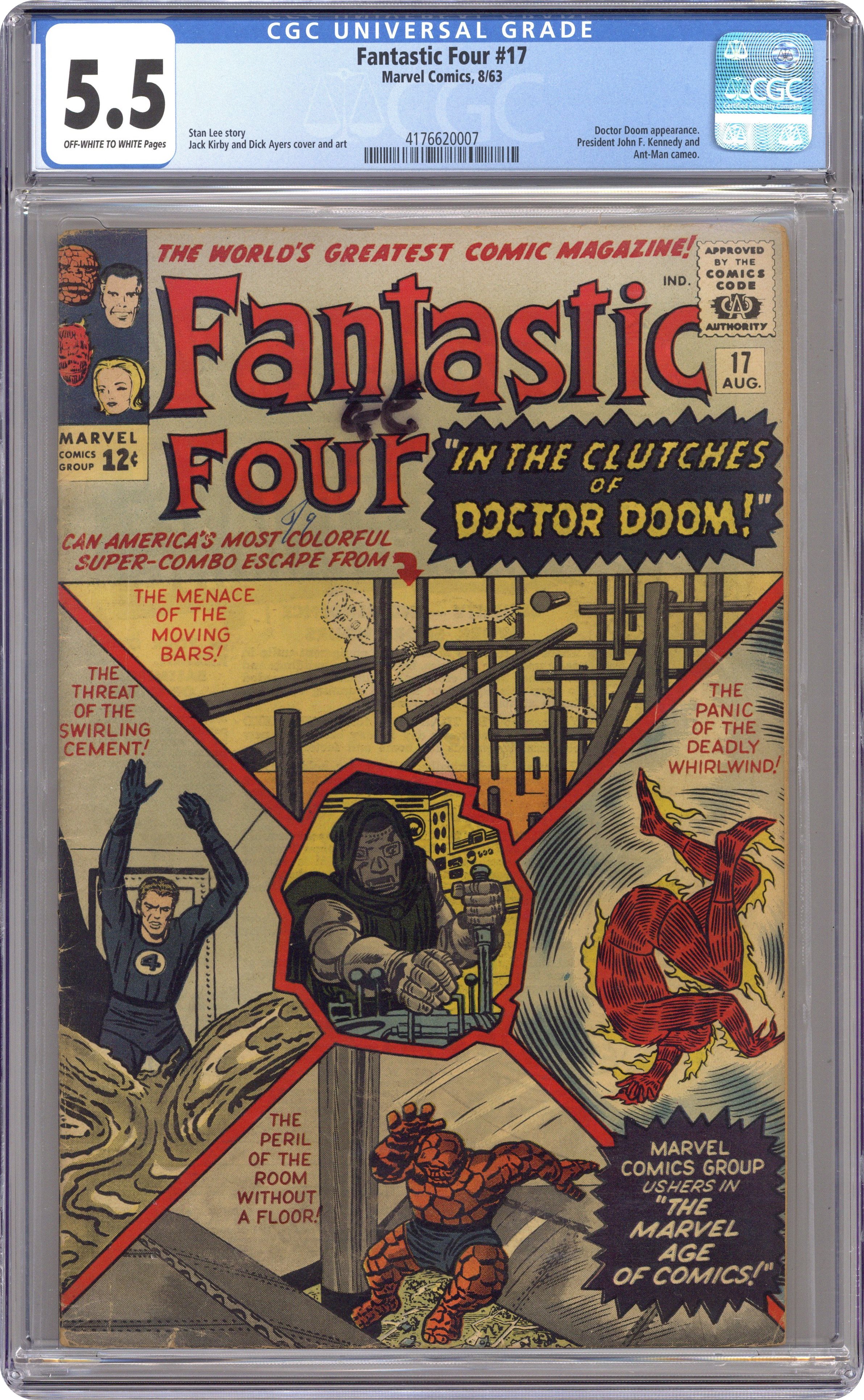 Cover pencils by Jack Kirby, inks by Dick Ayers. Defeated by Doctor Doom!, script by Stan Lee, pencils by Jack Kirby, inks by Dick Ayers; Back from the Micro-world, Doctor Doom attacks the Fantastic Four once more by kidnapping Alicia. Ant-Man guest appearance. 36 pgs. $0.12. Cover price $0.12. Grade: CGC 5.5 explanation of grade Condition: Used (collectible)