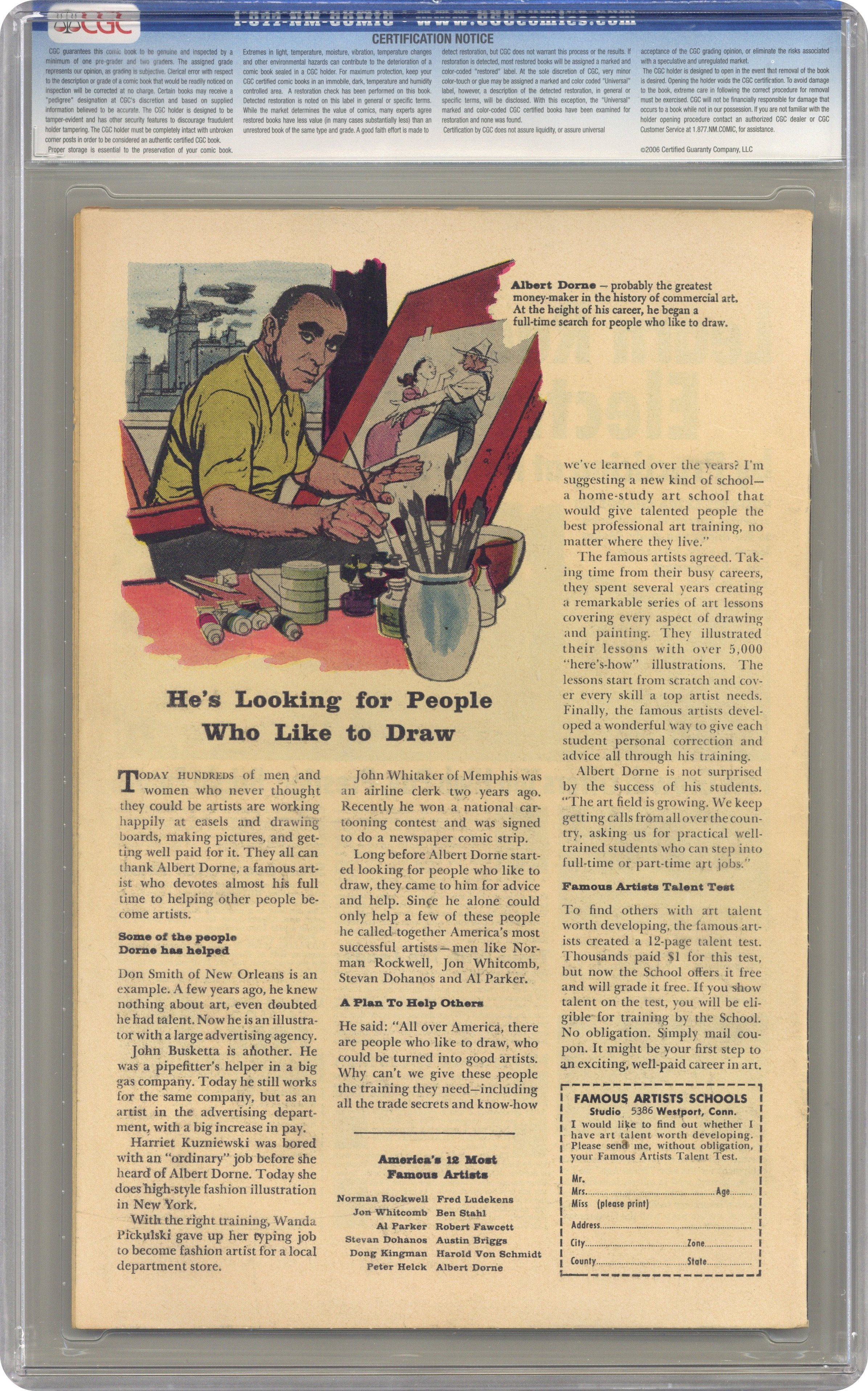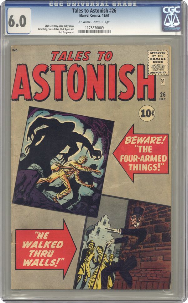 Cover by Jack Kirby and Dick Ayers. Look Out!! Here Come the...Four-Armed Men!, art by Jack Kirby and Dick Ayers; An explorer learns of an invasion of four-armed aliens. The Weatherman, art by Joe Maneely. He Walked Through Walls!, art by Jack Kirby and Dick Ayers; A stranger performs feats of magic, and offers anything that people might want if they sign a contract. Run, Rocky, Run!, art by Bob Forgione; A criminal on the run plans to stow-away on the experimental rocket he reads about, but finds out too late that is an advanced miniature rocket that cannot carry a pilot. Dream World, script by Stan Lee, art by Steve Ditko; A man repeatedly dreams that his bed is levitating, and cant tell if hes dreaming or not. 36 pgs., full color. $0.10. Cover price $0.10. Grade: CGC 6.0 explanation of grade Condition: Used (collectible)